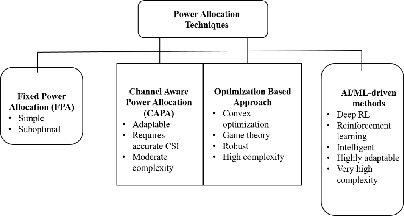 The latest trend in the development of power allocation methods is powered by artificial intelligence (AI) and machine learning (ML). In contrast to the traditional optimization or heuristic techniques, AI-driven approaches can train in the environment, which makes them a good fit for complex and dynamic network settings (Mahmood et al., 2022).