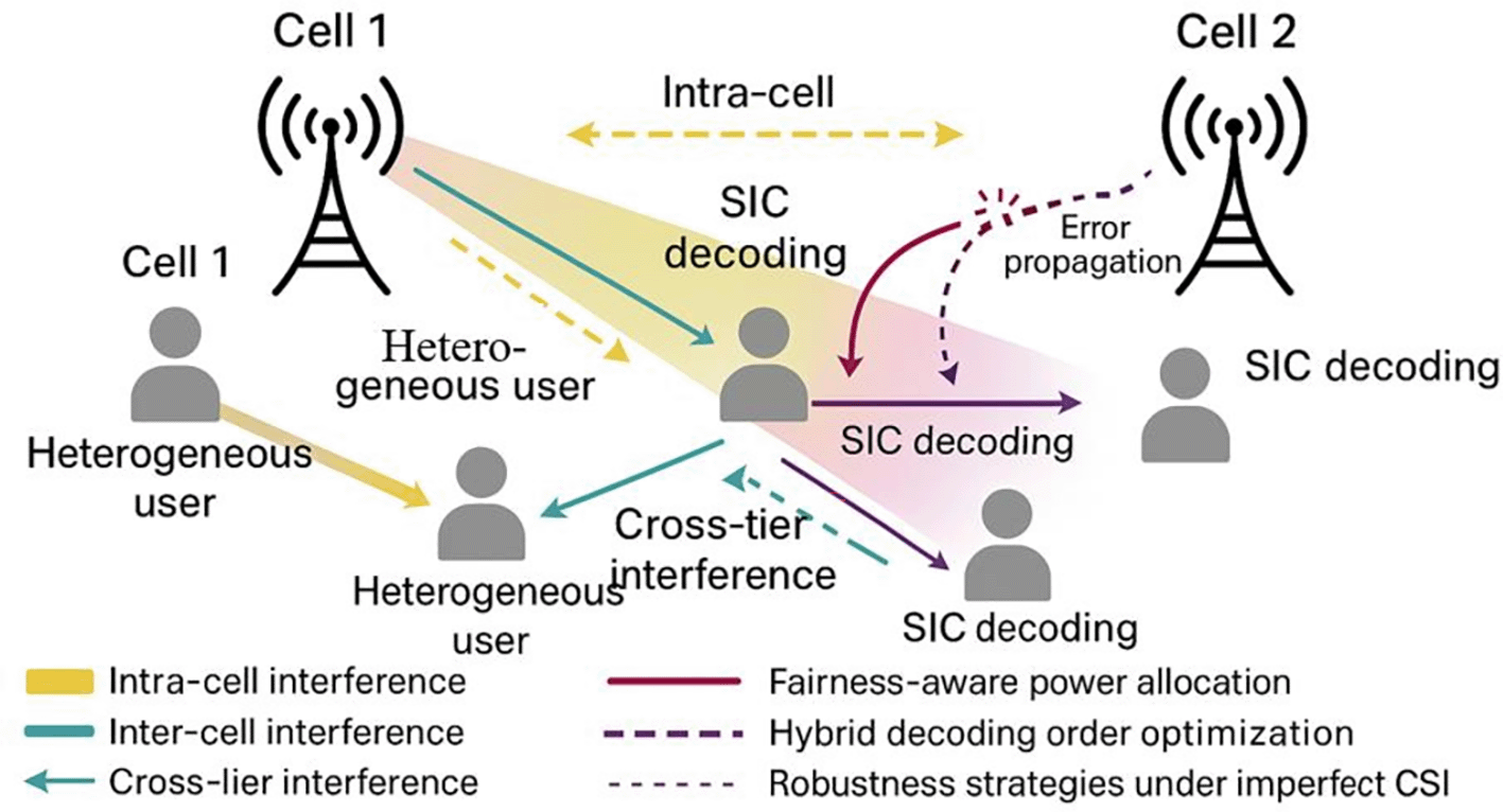 Interference control is one of the most important issues of NOMA system implementation, especially in terms of 5G and beyond networks. As NOMA multiplexes users in the power domain, its performance is extremely vulnerable to interference, both intra-cell and inter-tier (Zhang et al., 2022a). SIC’s performance depends on its power allocation accuracy and its ability to process and reduce the effects of various interference sources. It is in this vein that strategies that contribute to the improvement of SIC performance through interference characterization, management and adaptation have become the focus of current research (Salem et al., 2024).