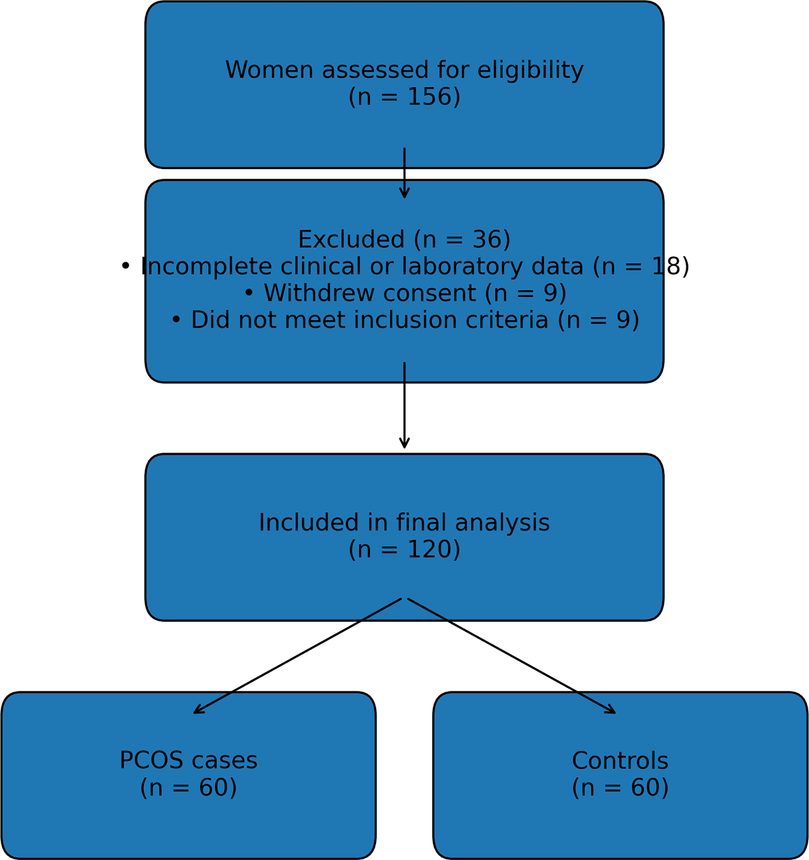 A total of 120 women were included in the final analysis, comprising 60 women with PCOS and 60 control women. Median age did not differ significantly between the control group (24.0 years, range 17.0–40.0) and the PCOS group (26.0 years, range 18.0–35.0; p = 0.087). There were no statistically significant differences between groups in body mass index, waist circumference, hip circumference, or waist–hip ratio (all p > 0.05).
