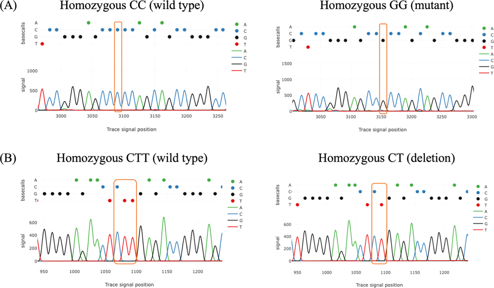 (A) The comparison between wild type and mutant genotypes of rs4889. (B) The comparison between wild type and deletion genotypes of rs5780218.