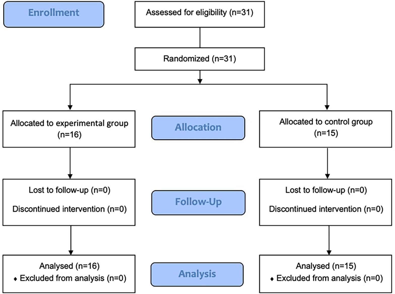 Participants were assigned to either the experimental or control group using simple randomization. During this process, participants were assigned to a group based on a random draw. Thus, each participant had an equal probability of being allocated to either group. Informed consent was obtained first and baseline assessments were performed. Only then were participants told which intervention group they belonged to, in order to retain concealment of allocation. This method minimized selection bias and hindered the randomization process.