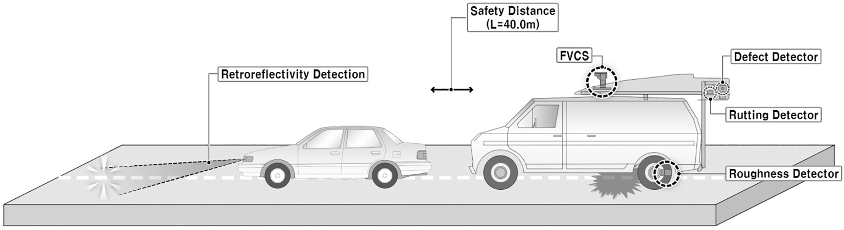 This figure illustrates a schematic configuration of the investigation conducted in this research to assess the condition of pavement markings and pavement surfaces.