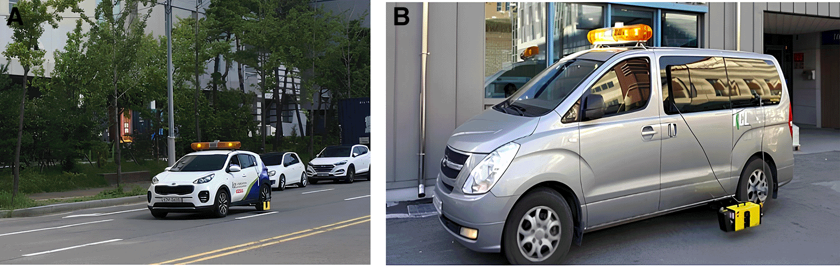 The image on the left shows the vehicle used by the Seoul Metropolitan Government to evaluate the condition of pavement markings, while the image on the right shows the vehicle utilized for pavement surface condition.