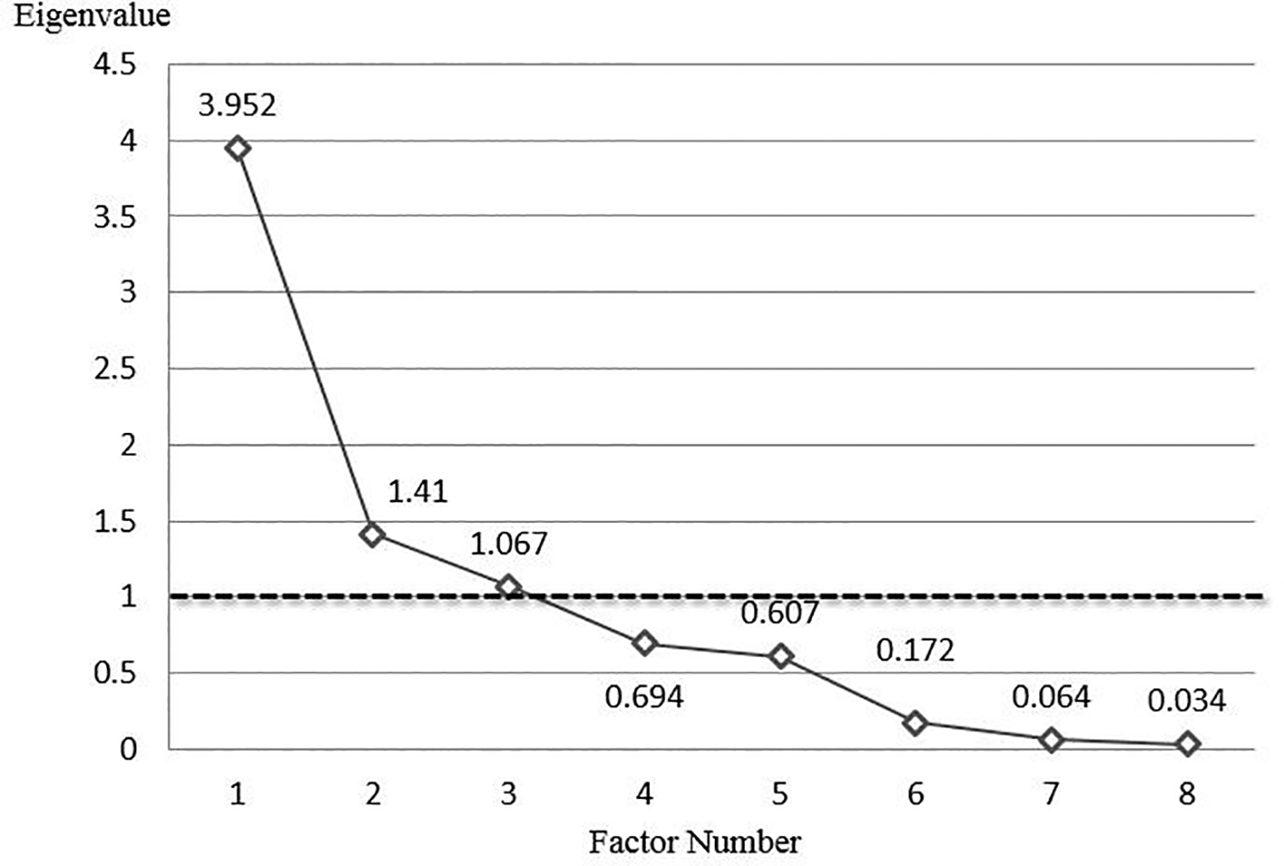 A scree diagram was derived from Principal Component Analysis (PCA). Statistically, the number of clusters is determined at the point where the eigenvalue falls below 1. Consequently, three clusters were deemed appropriate in this study, and the result is presented in Figure 4.