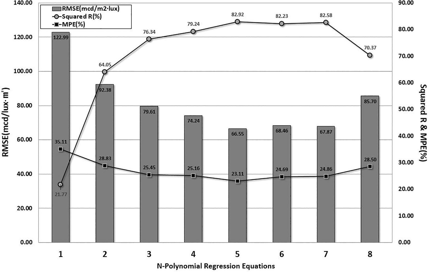 In the first step of developing the retroreflectivity prediction model, the regression approach for determining the coefficients in the model was applied to the measured data using a vehicle to measure the damage to pavement and road markings and the AADT from TOPIS administered by Seoul City. While developing the model, the first linear to n-polynomial nonlinear model was constructed based on the assumption that individual independent variables can nonlinearly affect the dependent variable. The errors and tendencies of the models were compared to determine the optimal model. The basic function of the n-polynomial nonlinear regression model is expressed as Eq. (3):
