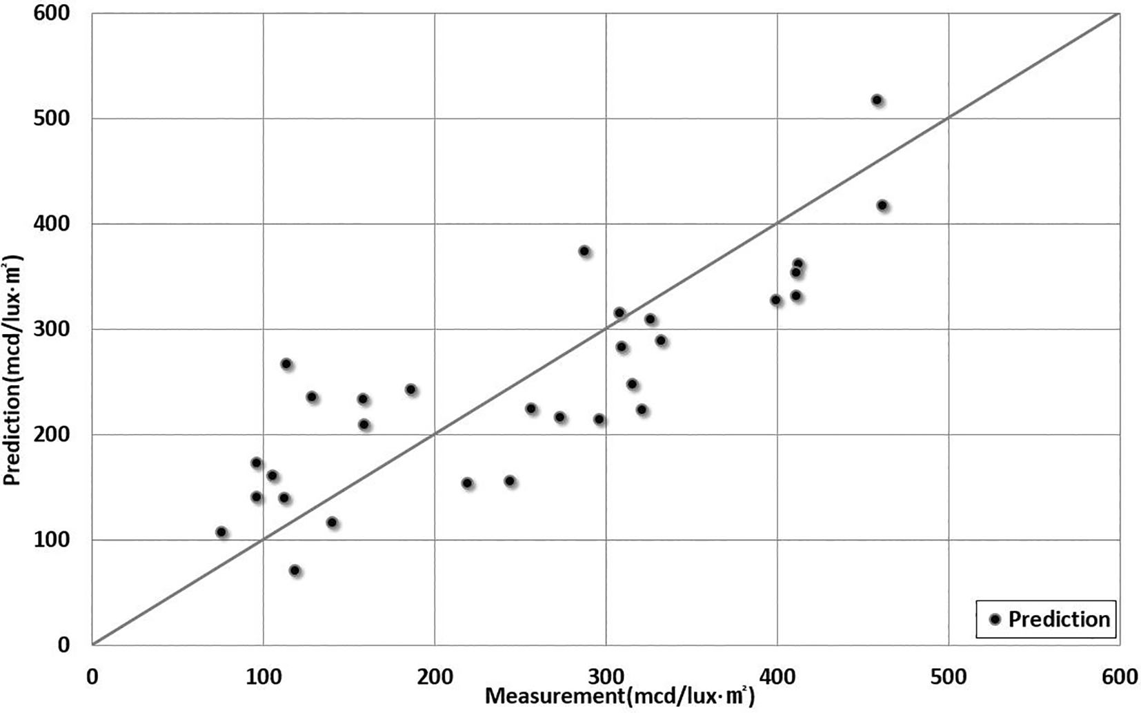 This figure compares the predicted retroreflectivity results obtained from the 5th-order polynomial regression model developed in this study with the actual measured values.