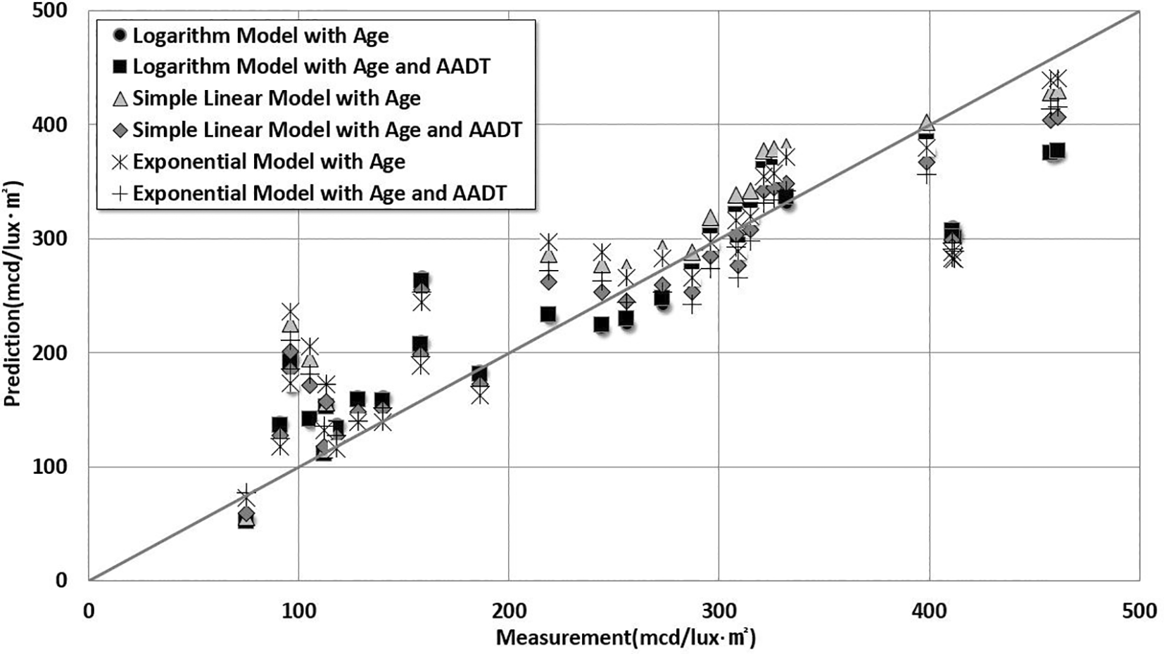 As shown in Figure 7, the logarithmic prediction model for retroreflectivity degradation based on the age of lane markings and AADT had the lowest RMSE of 54.02 mcd/lux·m2 and the highest determination coefficient of 91%. The simple linear regression model including age and AADT showed the lowest MPE (16%).