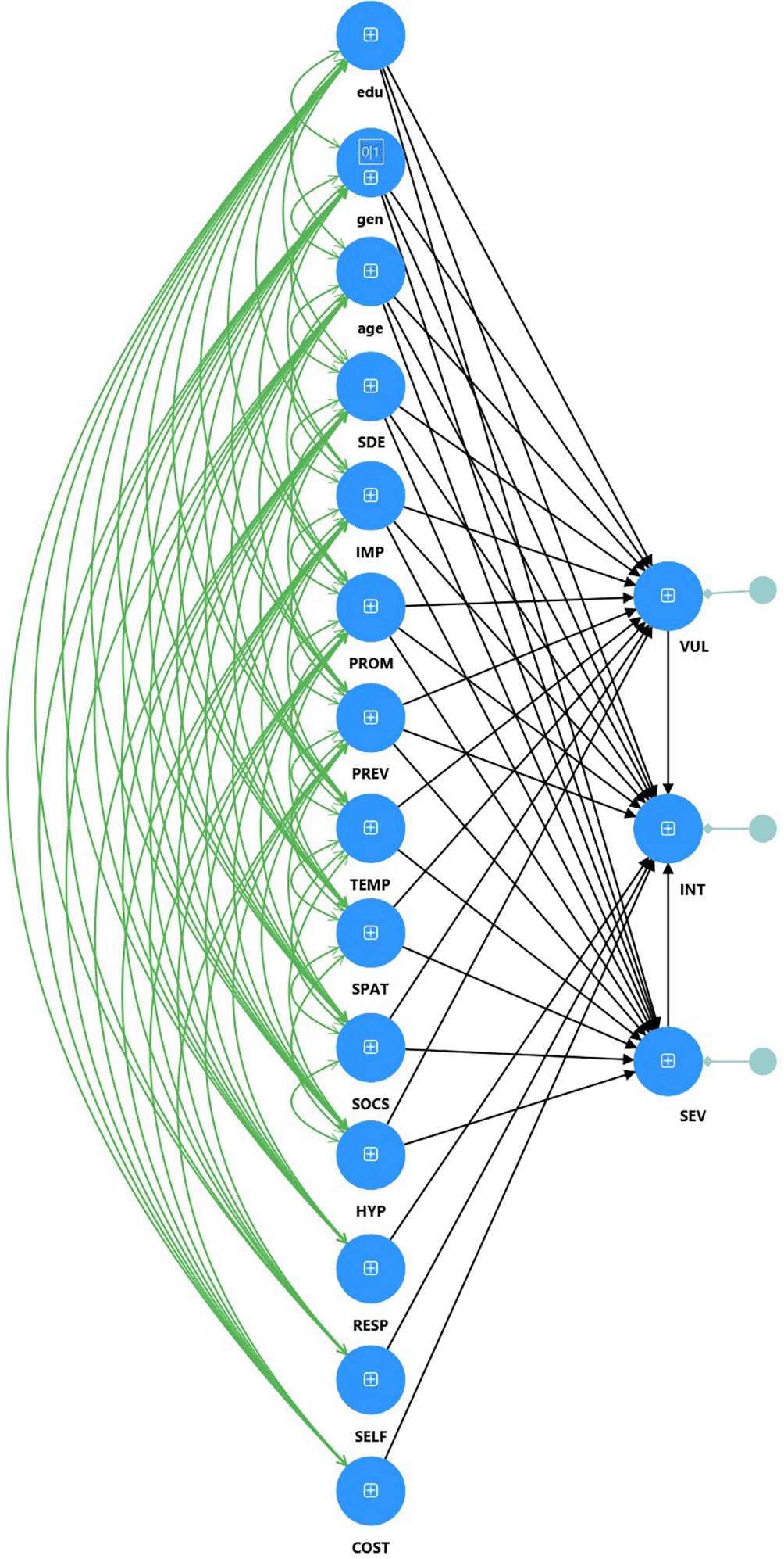 Following the recommendations of Hair, Black, Babin, Anderson,162 three criteria were used to assess the reliability of the measurement instrument. First, all Cronbach’s alpha values exceeded 0.7, and no instance of item-to-total correlation below 0.5 or inter-item correlation below 0.3 was observed. Second, all composite reliability values were above the 0.7 threshold, indicating satisfactory latent construct reliability. Third, standardized factor loadings from the CFA were above 0.7 for all items except five (i.e., hyp1, imp4, prev1, self3, and socl3, see Table 1). These items were retained for several reasons. First, in line with Hulland, Baumgartner, Smith,184 items with loadings above 0.5 may be retained if necessary to preserve the construct’s integrity. Eliminating these items would have resulted in some constructs being measured by fewer than three items, which is discouraged in SEM due to concerns about model stability.162 Second, following Collier,176 the retention of these items was justified as they did not negatively affect the average variance extracted (AVE) values. Third, the removal of these items did not lead to improvements in the measurement model’s goodness-of-fit (GOF) indices.