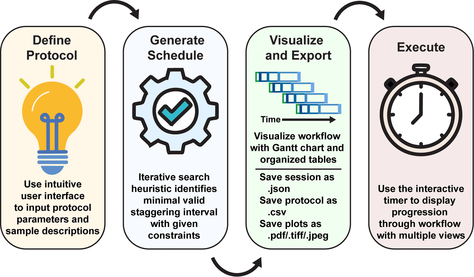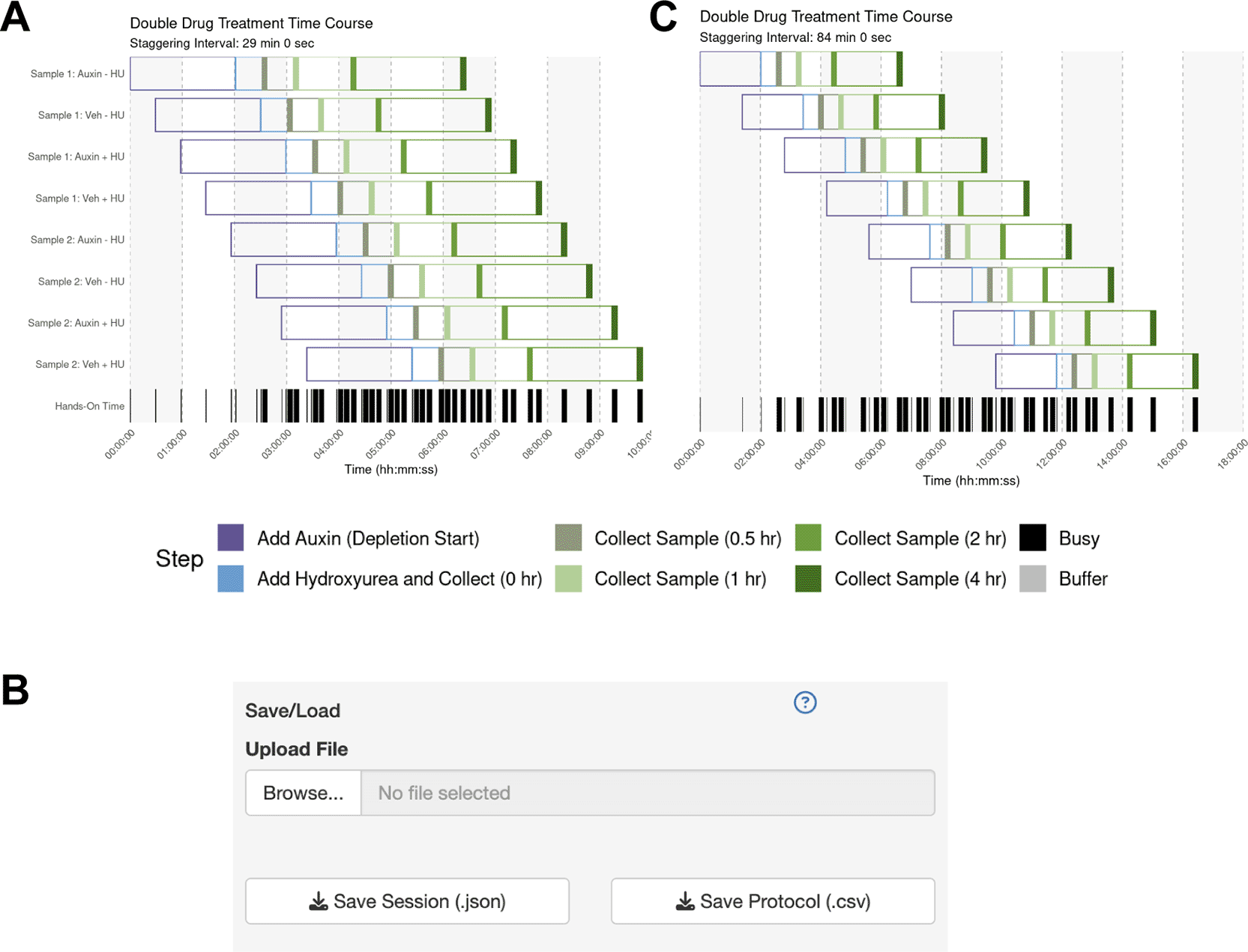 Upon initialization of the application, the user inputs the experimental parameters and generates a schedule automatically with a manually-provided or automatically-determined staggering interval. The workflow is then visualized with a Gantt chart and tables illustrating the staggered processing protocols for each sample or batch of samples. Using the “Live Time Course” tab, users can easily track the progression of their charted experimental workflow.