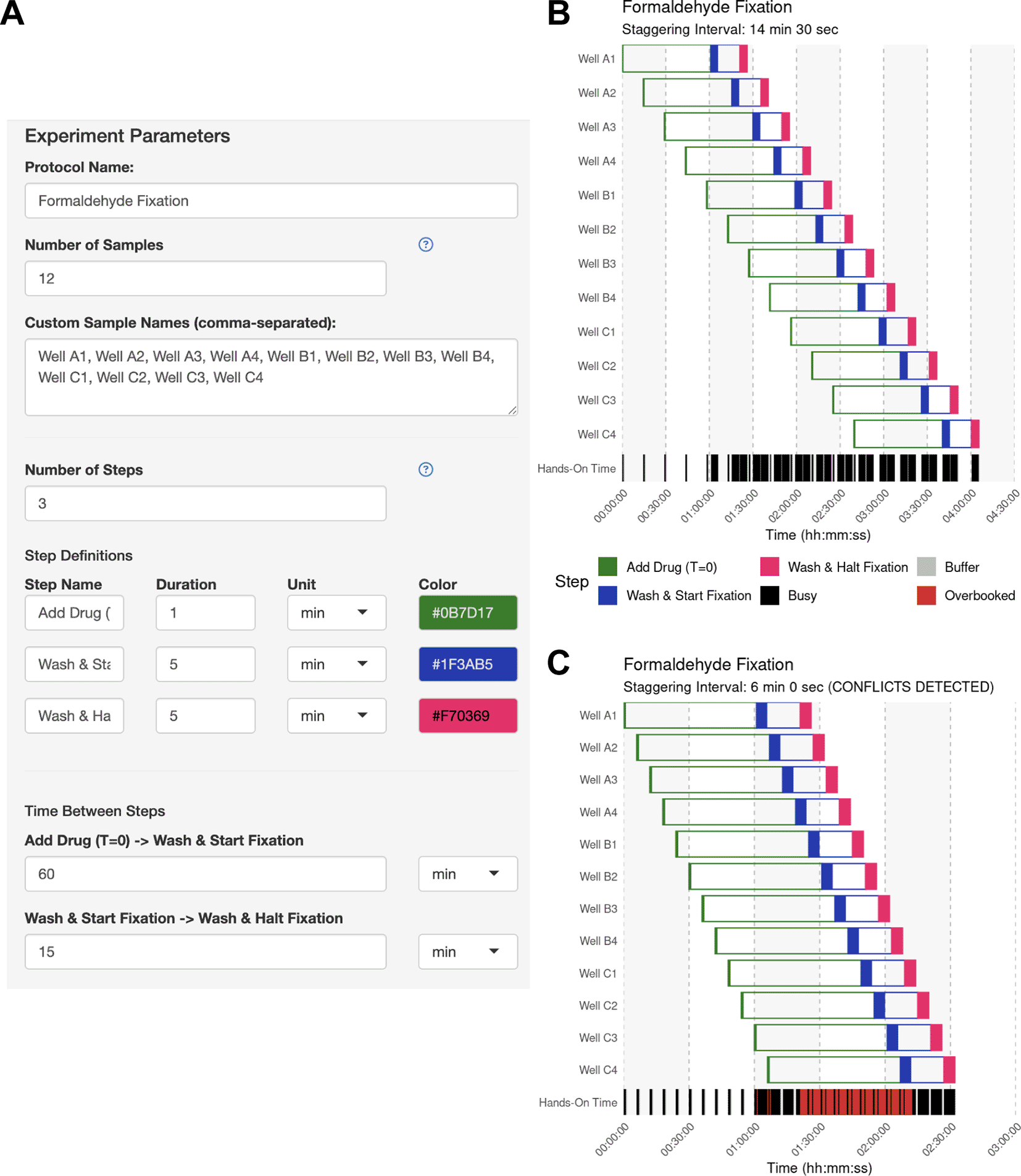 (A) The experiment parameter side panel is used to define the protocol. Users input sample descriptions and define each protocol step, including its name, color, hands-on duration, and the subsequent inter-step interval (wait time). In this example, each sample receives a 60-min drug treatment followed by a 15-min fixation. (B) Automatically identified interval for Use Case #1. Upon generating the schedule, the main panel of StaggR updates with a Gantt chart displaying a viable workflow, minimizing the staggering interval with the given constraints. The “Hands-On Time” row indicates periods that will require the user’s attention and periods where the user is expected to be unoccupied. (C) Manually defined interval for Use Case #1. Users may also provide a pre-defined staggering interval that may or may not produce a viable workflow. Conflicts between steps are immediately apparent and visualized in red in the “Hands-on Time” row. Users are further alerted to an incompatible schedule using a manually-defined interval in the subtitle of the Gantt chart.