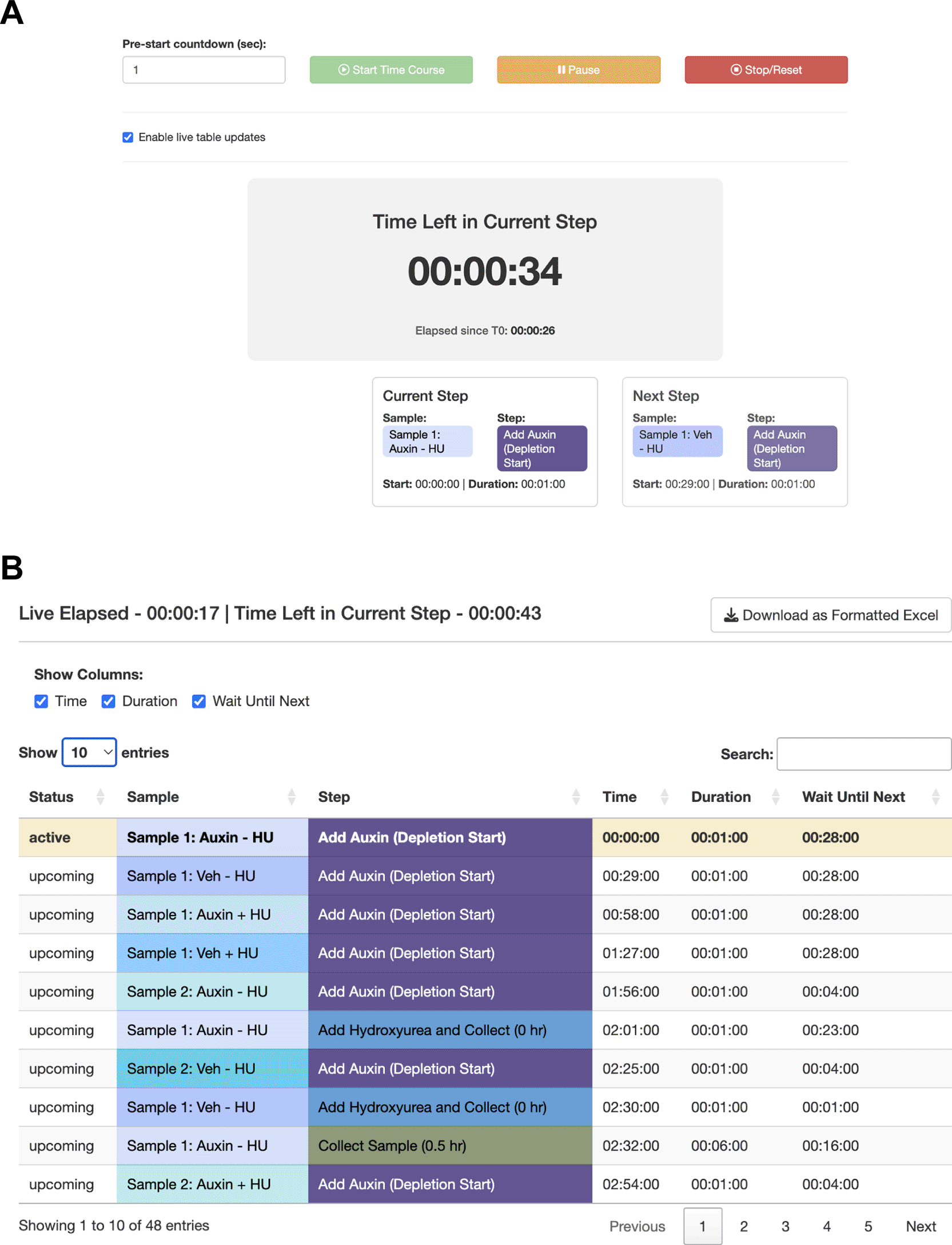 StaggR provides live guidance for executing a planned workflow. (A) The timer counts down to the start of the next required hands-on action for any sample. (B) The “Schedule by Time” table provides a chronological list of all steps, with live highlighting to track progression through the protocol.