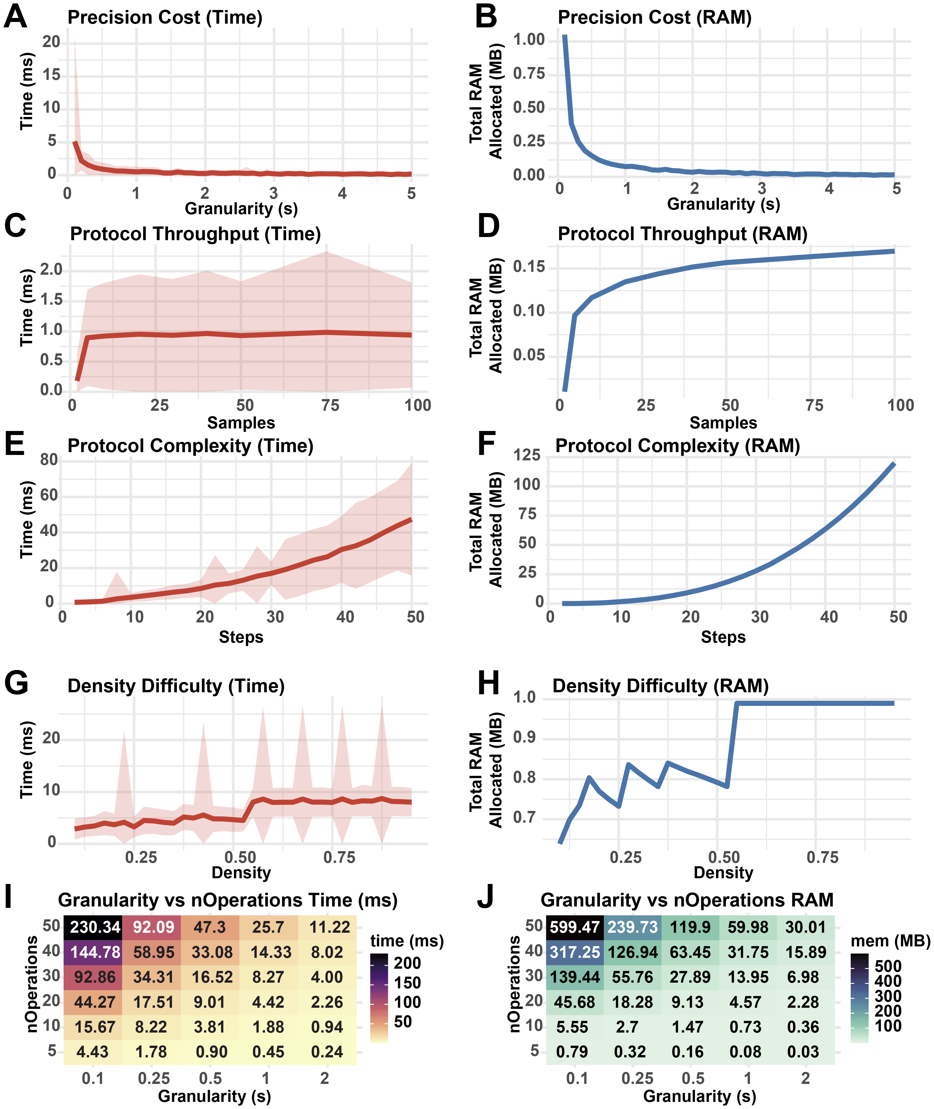 Performance metrics from 500 runs of StaggR schedule optimization logic against simulated protocols. A base protocol was defined with 5 steps of equal duration, optimization granularity = 0.5 min, nSamples = 50, buffer time = 0.25 min, and a total protocol time of nSteps * 10 min. The fraction of each protocol occupied by hands-on time was given by a density parameter from 0-1 where a density of 0.3 means 30% of the protocol duration was hands-on. Density was set to 0.5 unless otherwise stated. Each protocol was evaluated for the time to complete the optimization (A, C, E, G, I) and the total RAM used in the process (B, D, F, H, J). (A, B) Performance cost with increasing protocol granularity. (C, D) Performance cost with increasing sample throughput. (E, F) Performance cost with increasing number of operations per protocol. (G, H) Performance cost with increasing hands-on time density. (I, J) Resource usage with co-varying granularity and number of operations. Shaded areas represent the standard deviation in run times.