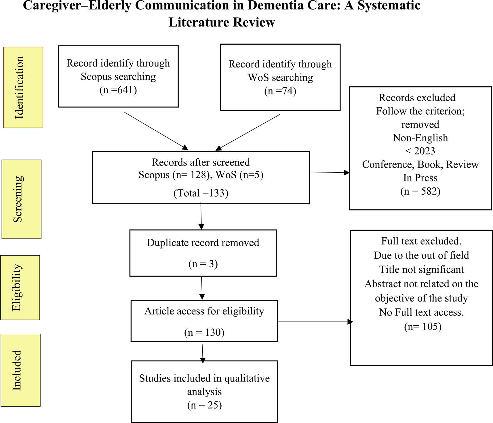 During the screening phase, potentially relevant study items are evaluated to ensure their alignment with the specified research subject or topics. In this phase, the terms “caregiver, elderly, dementia, communication” are commonly used to select study topics. Duplicate papers are also removed at this stage. Initially, 582 articles were excluded, leaving 133 for further review based on specific inclusion and exclusion criteria (refer to Table 2). The primary criterion was the literature, as it serves as the main source of practical guidance. This category excludes book reviews, book series, meta-syntheses, meta-analyses, conference proceedings, and chapters that were not part of the most recent research. The review was restricted to English-language publications released between 2022 until 2025. A total of 130 publications were ultimately retained after removing duplicates. The inclusion/exclusion criteria are presented in Table 2.