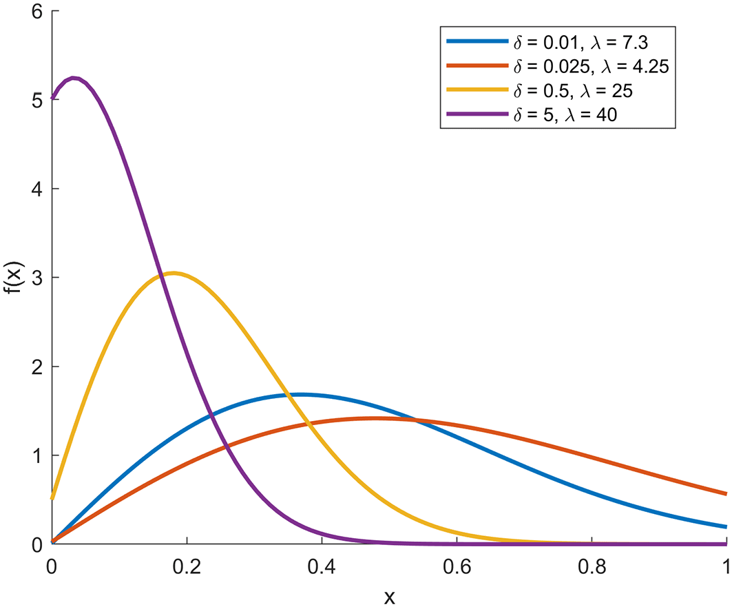 Table 1 shows the moment values when r = 1, 2, 3, and 4, as well as the values of variance, skewness, and kurtosis, where the data values were confined to the interval [0,1], which represents the integral limits for the moments.