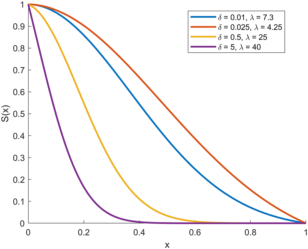 Figure 3 shows the survival function (S(x)), which gradually decreases as x increases. It is evident that increasing decreases the probability of survival, while increasing λ slows the rate of decrease.