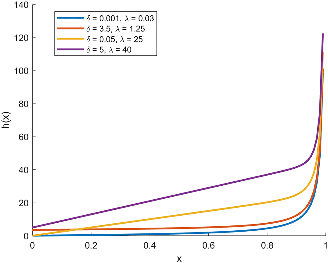 Figure 4 shows the hazard function (H(x)), which exhibits an increasing pattern indicating a rising probability of failure or risk as x increases. It is also evident that higher λ values lead to a higher risk rate at higher x values.