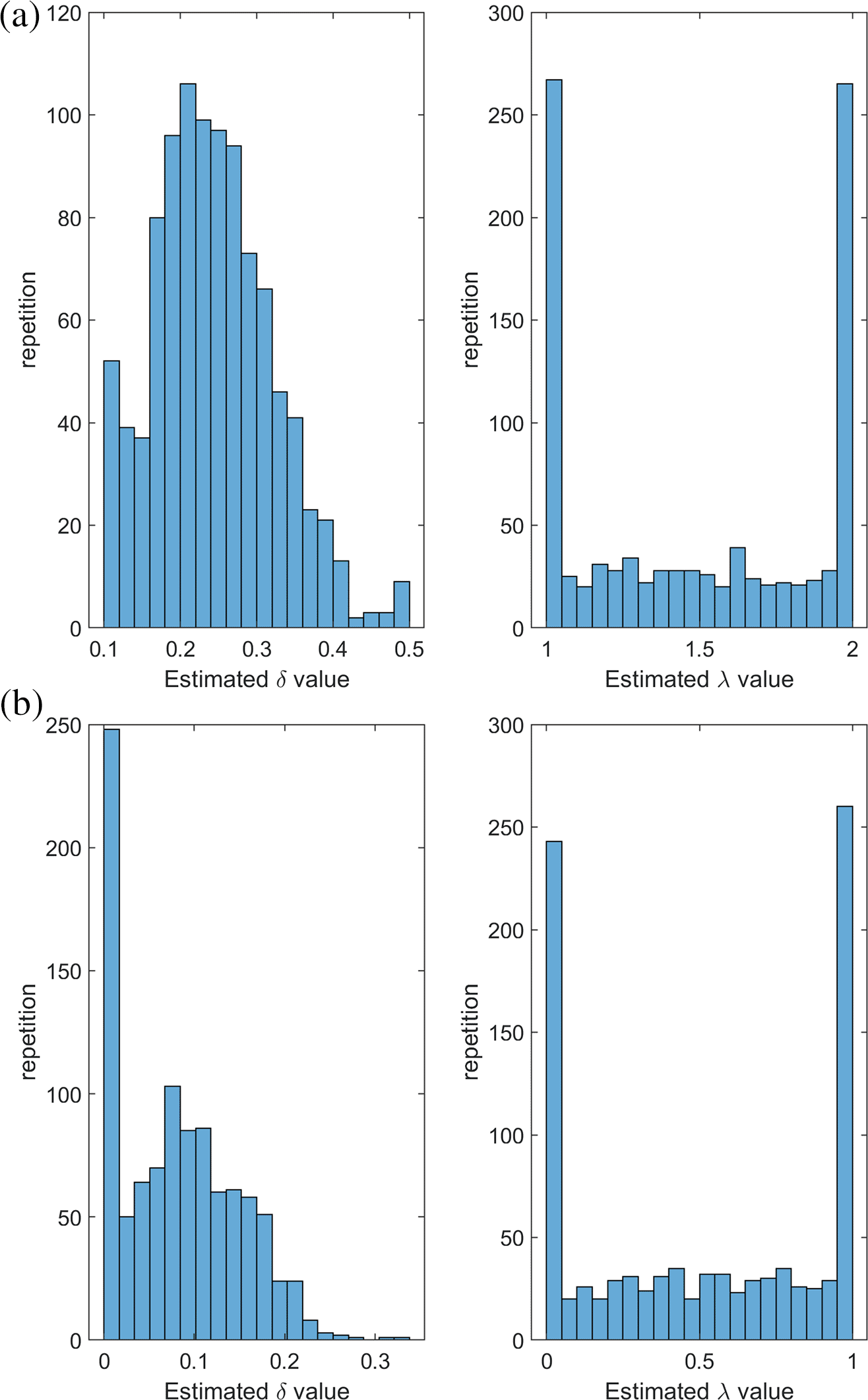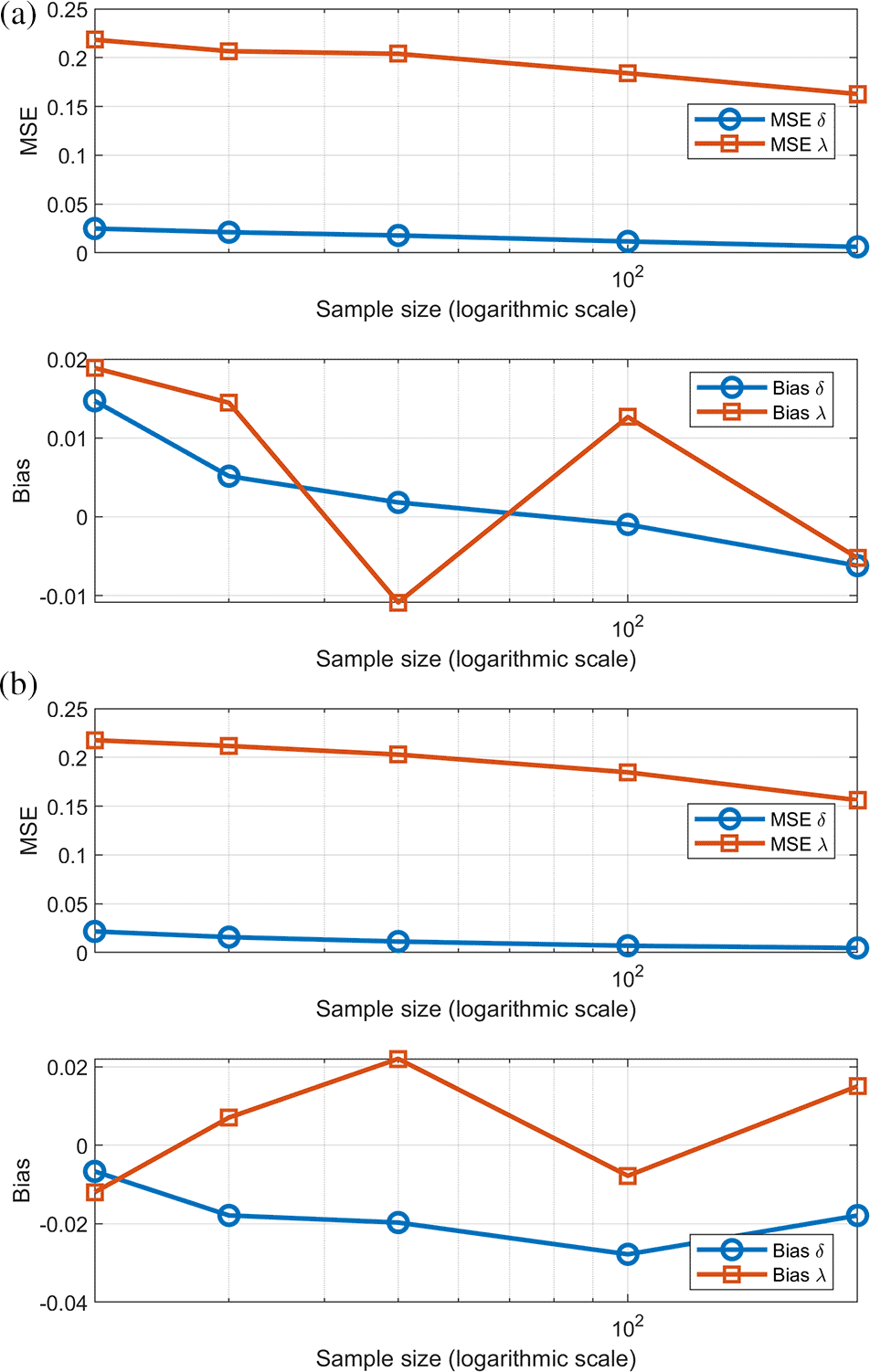 Monte-Carlo simulation applied to examine statistical performance of MLE for [0,1]-RTERD. The evaluation centered on two primary accuracy indicators: bias and mean squared error (MSE). To achieve this, random samples were generated based on Equation (18), using different sizes (n = 20, 30, 50, 100, and 200), and repeated across L = 1000 replications. Parameter estimates were obtained via (MLE), with starting values specified as δ = 0.25, λ = 1.5 and δ = 0.1, λ = 0.5. The simulations were implemented using MATLAB (version 2018a).