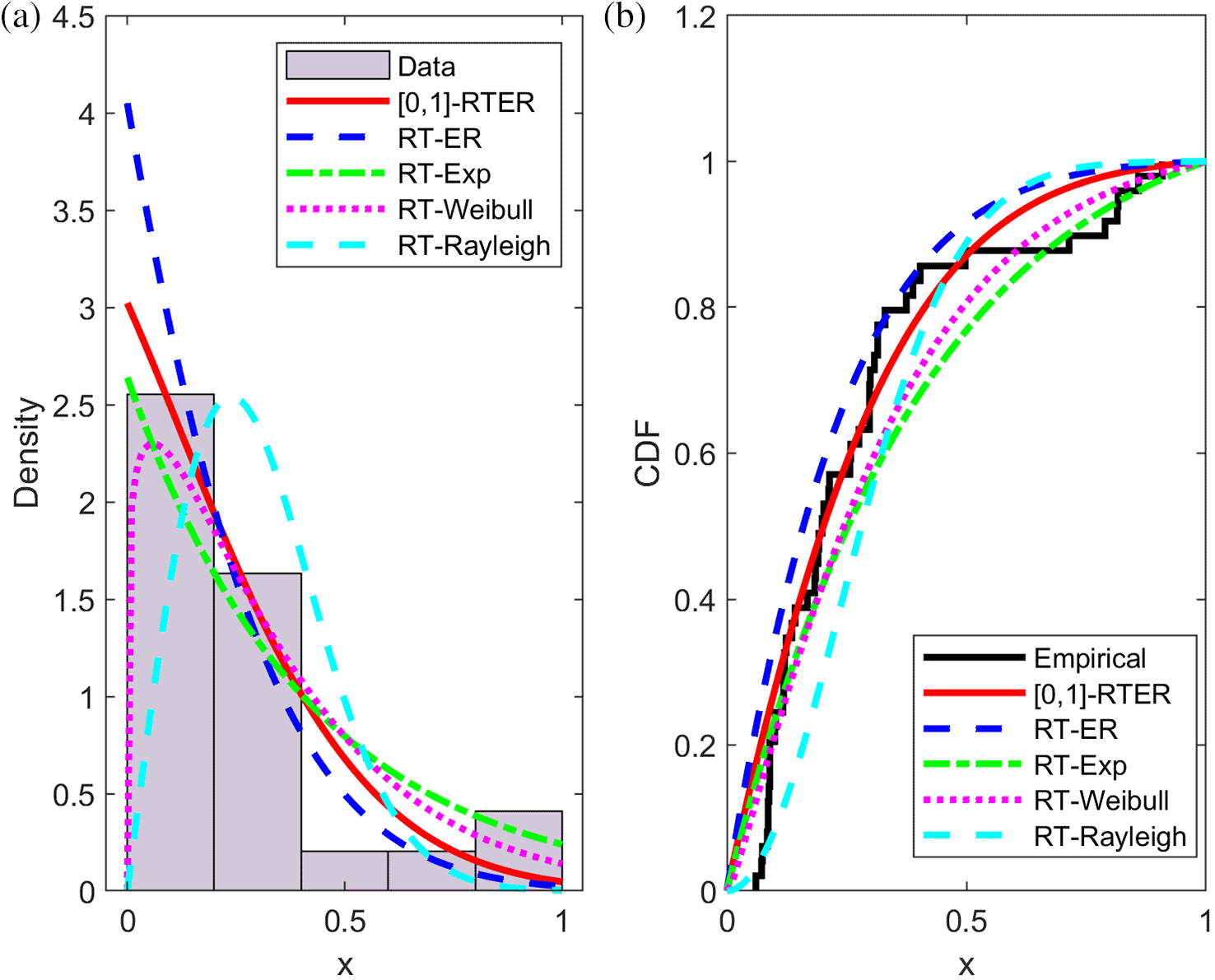 Figure 7(a) it is evident that [[0,1]-RTER (solid red line) best matches the overall pattern of the sample data, particularly in the initial region of small x-values, where its curve closely resembles the experimental density pattern. The other distributions show relative deviations; RTR tends to overestimate small values, while ER and RTE provide less accurate estimates in the tail regions.