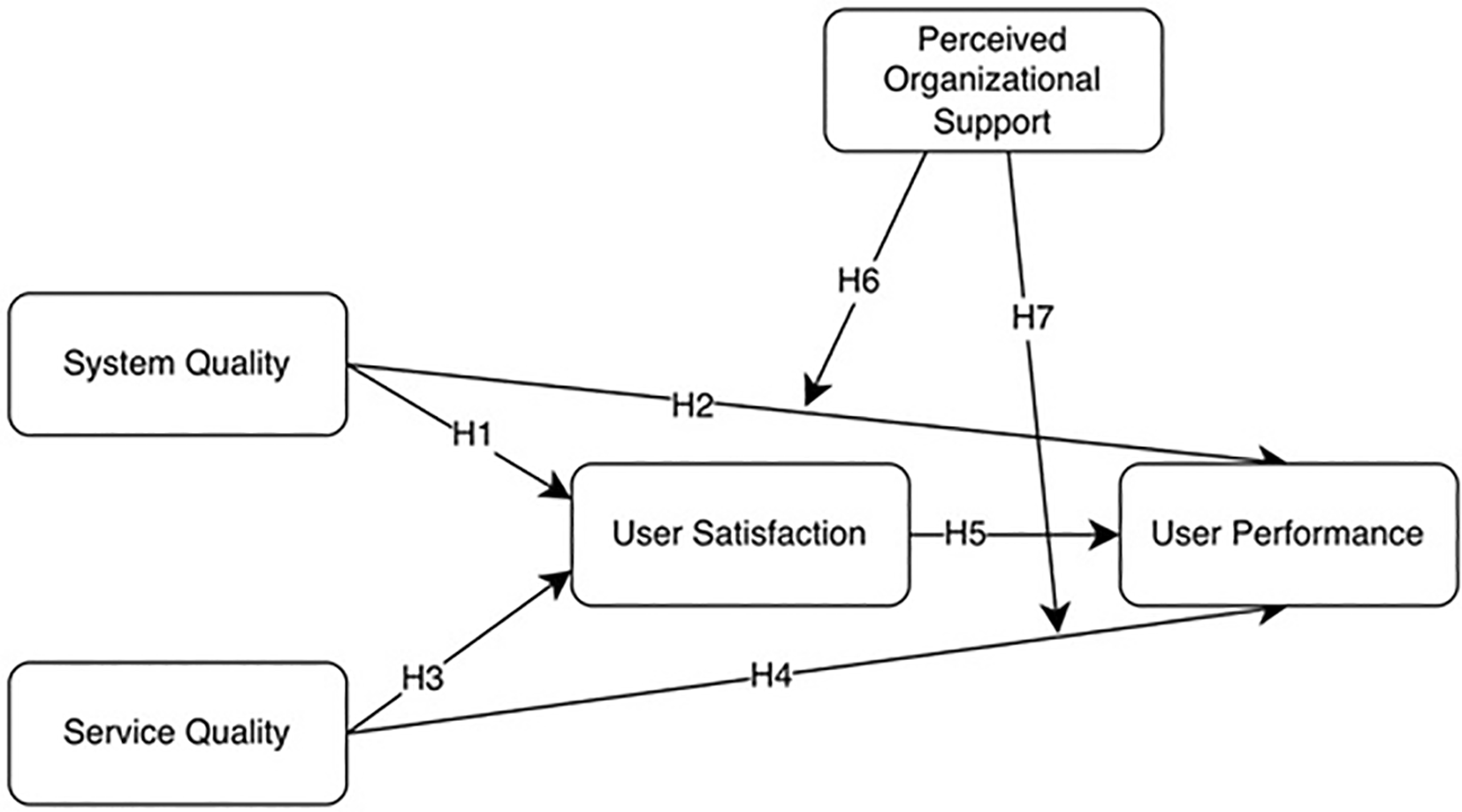 System Quality, Service Quality, Perceived Organizational Support, User Satisfaction, User Performance.