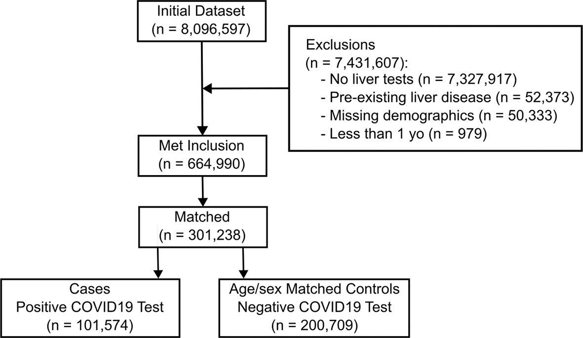 Matched controls were individuals with their first negative COVID-19 test within the study period and at least one subsequent liver-related blood test (as defined above) in the 28 days following the negative test and no further COVID-19 test within the subsequent 28 days. These individuals otherwise met the inclusion criteria. COVID-19 positive cases were then each matched by age (in years) and sex with two control individuals, with the same exclusion criteria. Controls were always unique individuals from cases, by their unique identifier. Thus, those who were controls that at a later date were otherwise eligible to become cases (by later having a positive COVID-19 test and otherwise met the inclusion criteria) were excluded. The data extraction process is summarized in Figure 1.