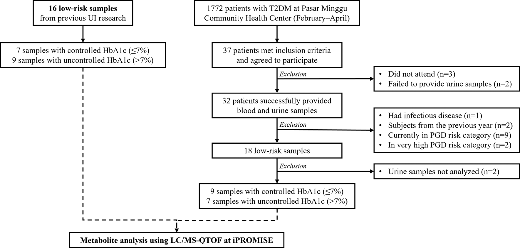 The research was conducted as an observational study using a cross-sectional design. A total of 32 samples were obtained from Pasar Minggu District Health Center in February 2023–April 2024. The samples were divided into two groups based on their HbA1c levels: controlled HbA1c (≤7%) (n=16) and uncontrolled HbA1c (>7%) (n=16). Blood samples were collected for HbA1c and eGFR measurements, while urine samples were analyzed for UACR and metabolites. Subject participation was obtained through the signing of informed consent after a thorough explanation of the study. Sample collection was carried out using the consecutive sampling technique, wherein subjects meeting the predefined inclusion criteria were selected and included until the required sample size was achieved. The inclusion criteria included (1) age ≥36 years old, (2) treatment of metformin-glimepiride for at least six months, and (3) included in the low-risk category for diabetes kidney disease based on KDIGO 2022. Exclusion criteria included (1) no urine and blood specimens were obtained; (2) pregnant and lactating women; (3) severe anemia with or without receiving blood transfusions; (4) stroke, chronic liver disease, congestive heart failure, and infectious diseases.