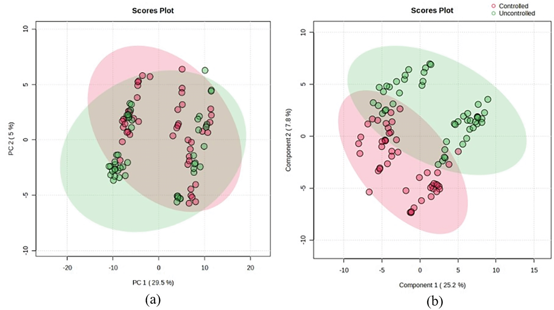 Figure 2. Principal Component Analysis (PCA) Score (a) and Partial Least Squares-Discriminant Analysis (PLS-DA) Score (b) between Controlled and Uncontrolled HbA1c Groups.