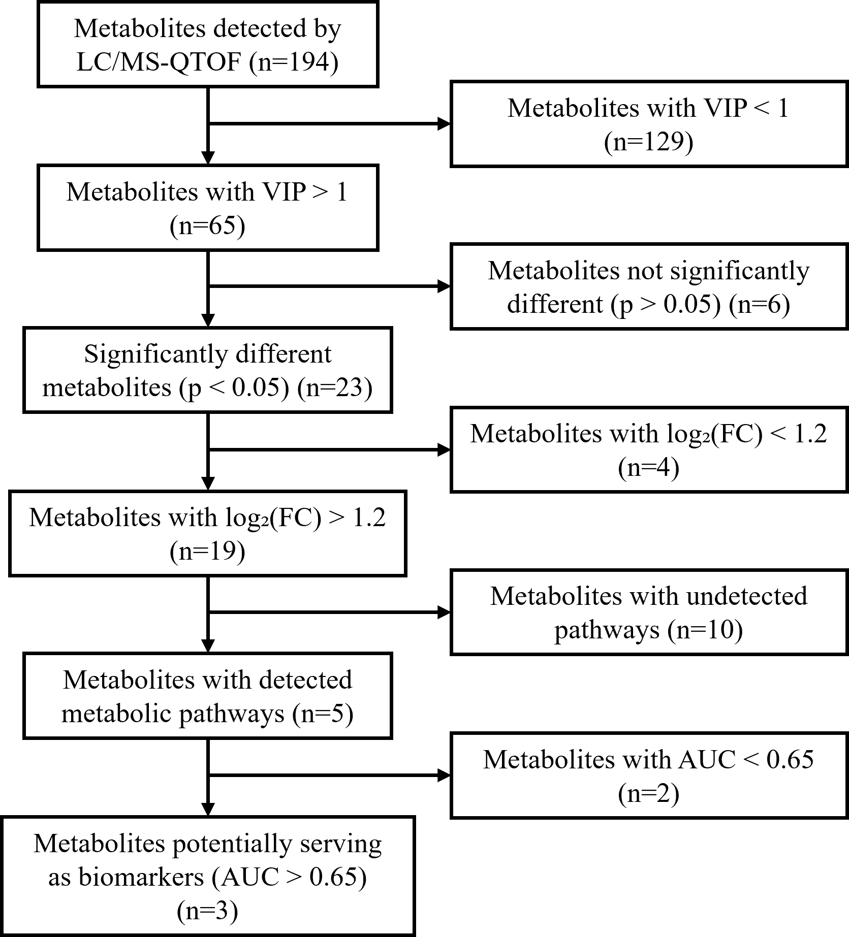 Following the initial screening based on VIP score, p-value, and log2(FC) criteria, differential metabolites were identified using the HMDB, METLIN, Metabolomic Workbench, and PubChem databases. The significant metabolites identified by VIP score analysis were then used for biochemical pathway analysis. The diagnostic performance of the selected classifiers was evaluated using ROC implemented in MetaboAnalyst 6.0.