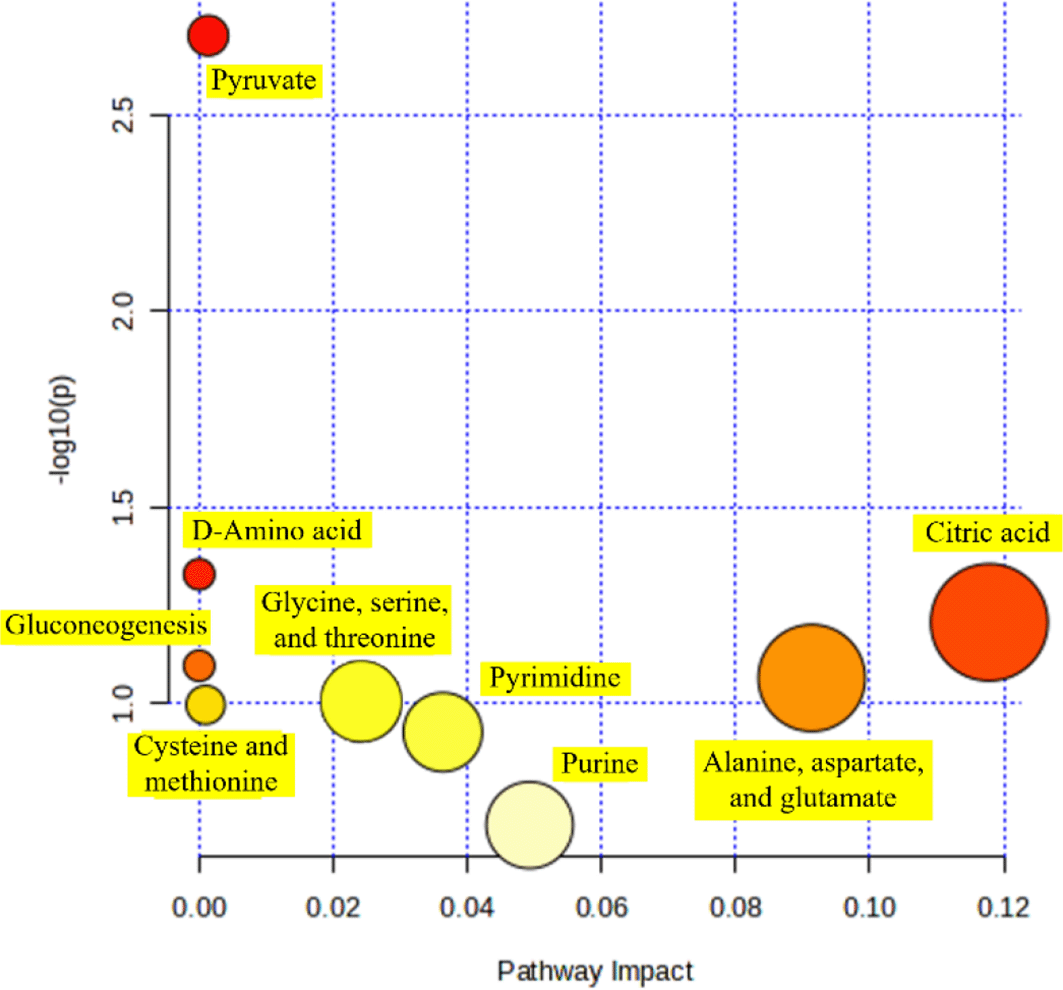 From the previous metabolites screening, 15 metabolites met the criteria and were further analyzed to identify the biochemical pathways involved for each metabolite and their potential as biomarkers. The significance of the pathways was illustrated by the position of circles in the pathway analysis graph, where those farther to the right indicated a higher impact ( Figure 6). Each circle in the graph represented a pathway involved in the metabolism of influential metabolites, and from the graph, it was found that the most significant metabolic pathway was the citric acid cycle (Krebs cycle).