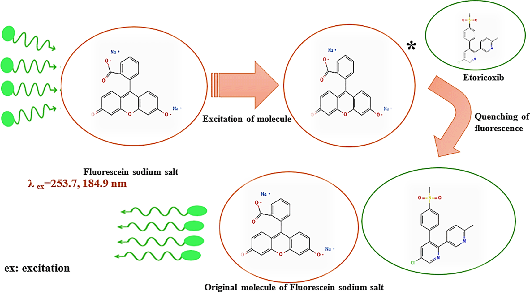 Scheme 1. Mechanism for etoricoxib as an injected sample for quenching of continuous fluorescence of fluorescein sodium salt as a carrier stream.