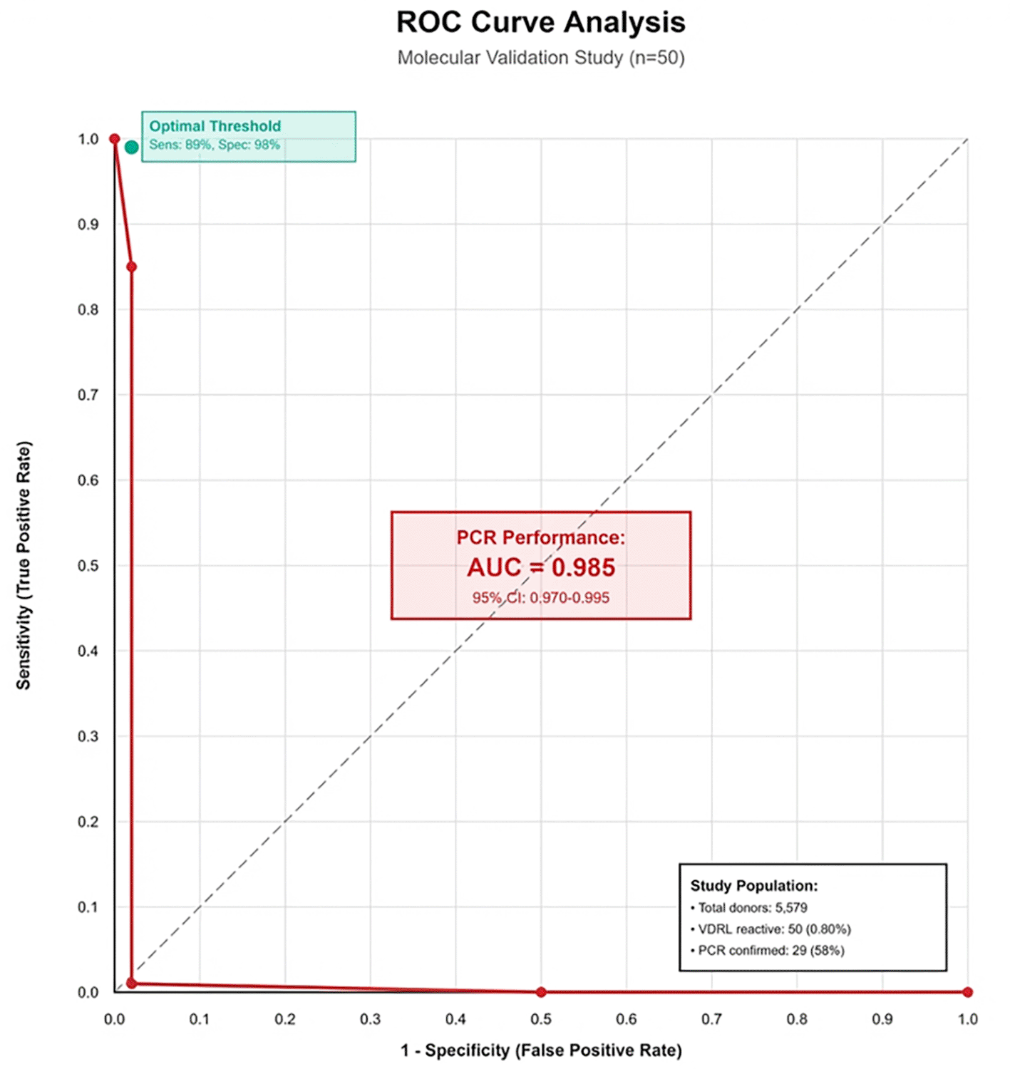 Receiver operating characteristic (ROC) curve demonstrating PCR discriminatory performance as the molecular reference standard. PCR achieved an AUC of 0.985 (95% CI: 0.970-0.995), indicating excellent diagnostic accuracy. ELISA and rapid immunochromatographic tests could not be evaluated through ROC analysis due to study design limiting molecular testing to VDRL-reactive specimens only. The diagonal reference line (AUC = 0.5) represents chance-level discrimination, while the PCR curve approaches the upper left corner, indicating near-perfect discrimination between true-positive and false-positive cases ( Figure 1).