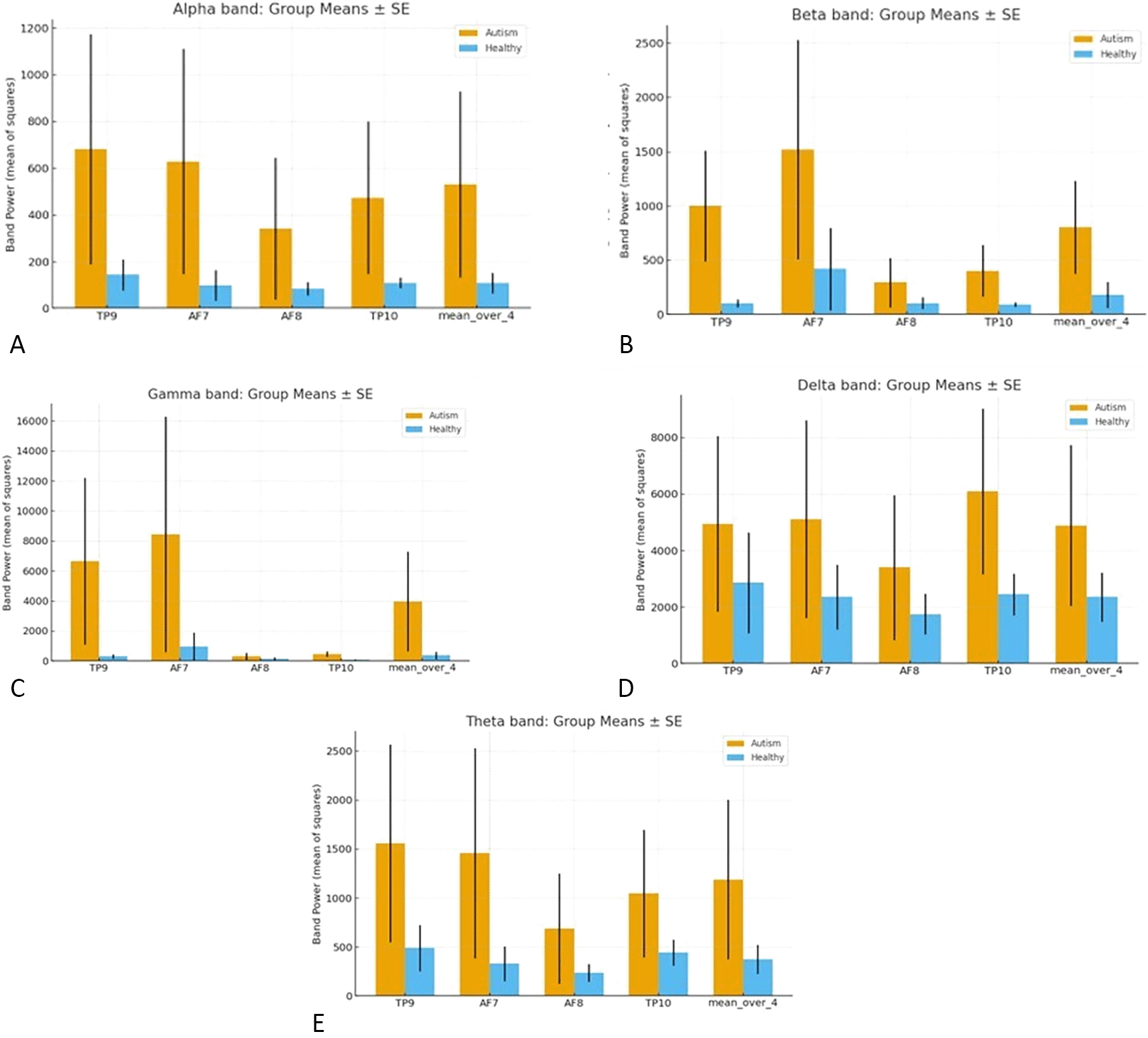 Across all the Figures 2A–2E, the Autism group’s exhibit higher power than the Healthy group, indicating higher absolute power on average. However, the relative β at TP9 and relative γ at TP10, are the clearest discriminators of ASD vs. controls.