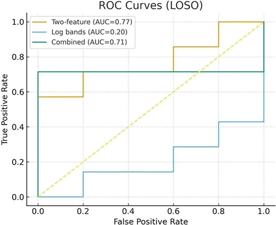 Figure 3 summarizes the results for the Area under ROC curve, where we utilized the leave-one-subject-out (LOSO) principle. The figure illustrates the Receiver Operating Characteristic (ROC) for the three models (two-feature, log band, and combined 7 features)
