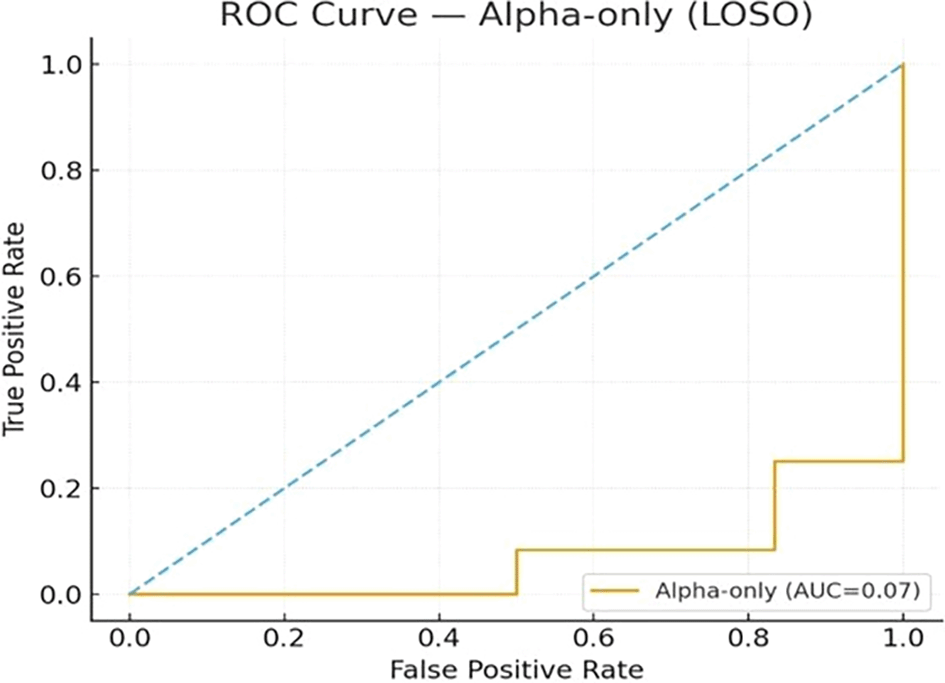 The log-bands baseline (AUC = 0.20) is a broader feature set using log-transformed band power across all sensors (alpha, beta, gamma, theta, delta). LOSO. The entire ROC curve falls below the diagonal, which represents the 0.5 chance (FPR=TPR). This indicates weak or inconsistent signal in these generic summaries for this dataset.