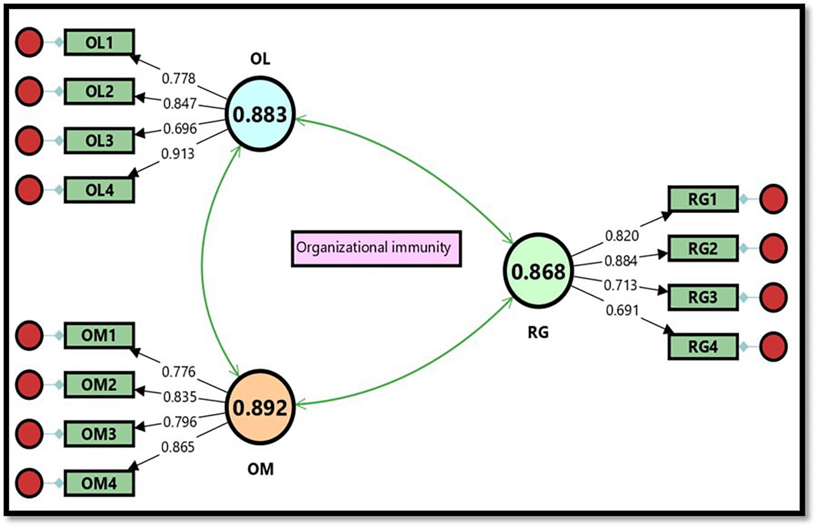 As can be seen in Figure 3 which presents the questions of the dimensions of the organizational immunity model, namely (organizational learning, organizational memory, regulatory genes), with a total of (12) questions, and as shown in Table 3 the values of the composite stability coefficient (CR) for the dimensions of the organizational immunity variable (0.888, 0.890, 0.867), which are within the acceptable limits (> 0. 70). The results also showed that the values of Cronbach’s alpha coefficient for the same dimensions were (0.883, 0.892, 0.868), which also exceeds the accepted normative value (0.70), and indicates the existence of internal consistency between paragraphs, and the values of the average variance extracted (AVE) came within acceptable limits, amounting to (0.660, 0.670, 0.610), exceeding the required minimum threshold (0.50). These findings show that the sub-dimensions have a major role in understanding the organizational immunity variable’s overall variation as well as the model’s dependability and ability to effectively describe the relationships between its dimensions.