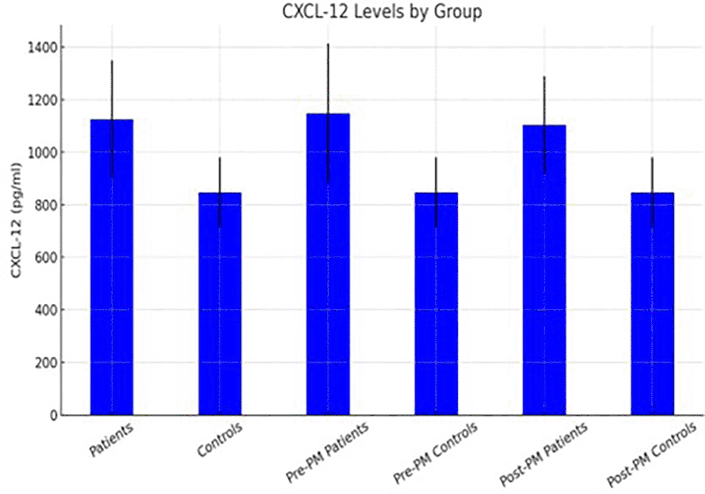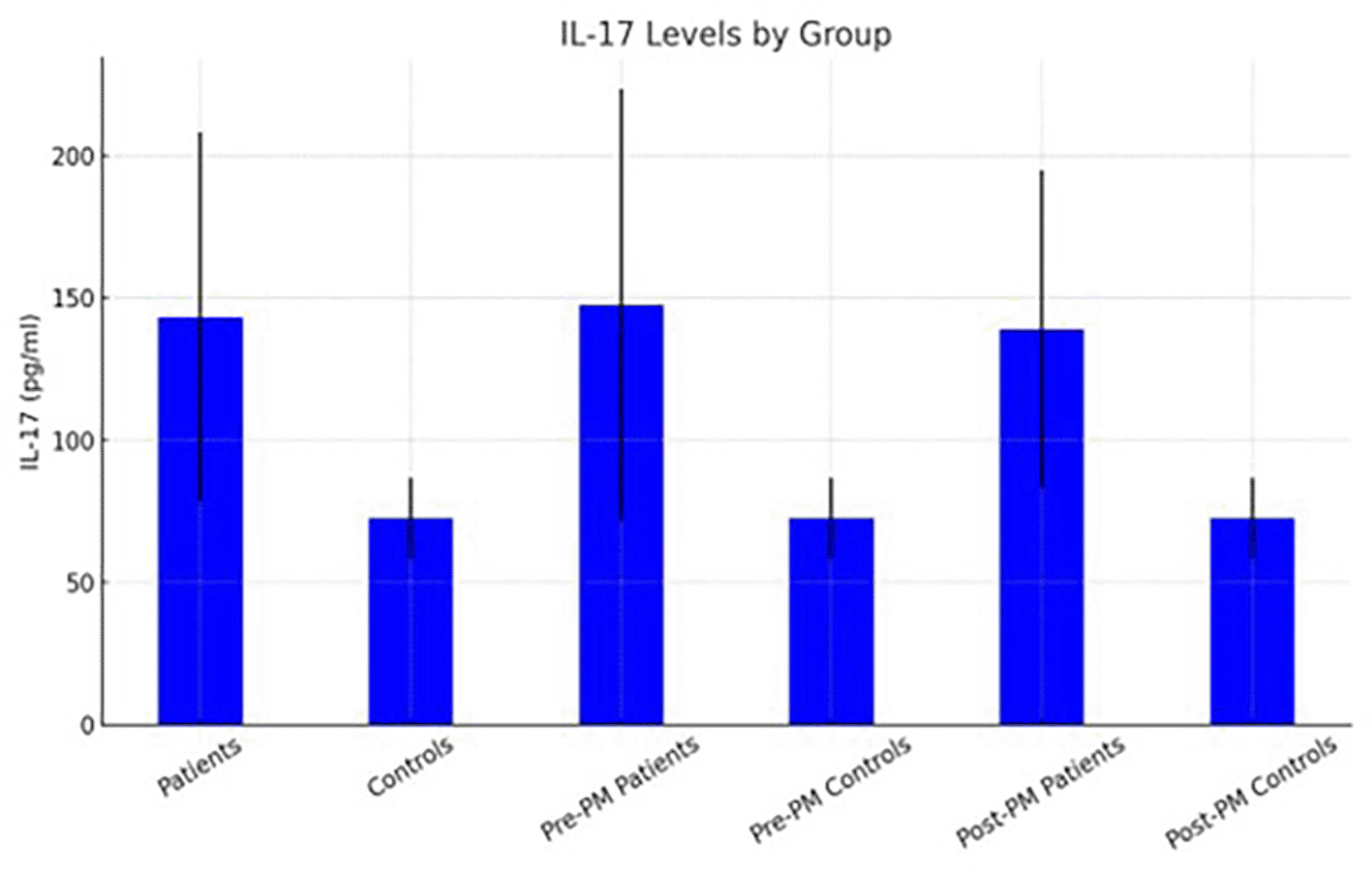 Figures 2 and 3 illustrate the distribution of mean serum levels of CXCL12, IL-34, and IL-17 across all subgroups, with standard-deviation error bars highlighting interindividual variability. The graphical trends corroborate the numerical results, showing a consistent up-regulation of the studied cytokines in both premenopausal and postmenopausal patients relative to controls.