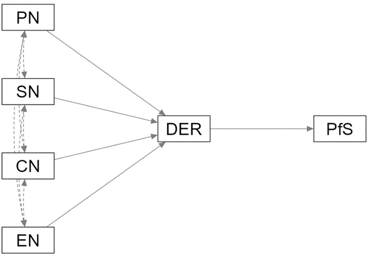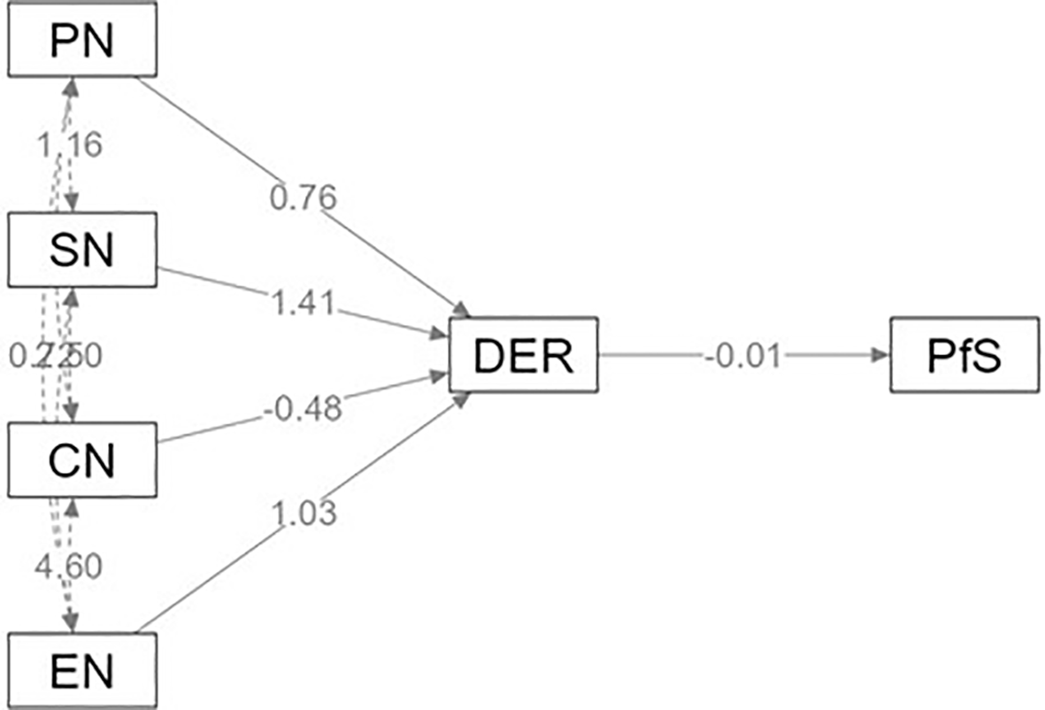 The results of path analysis indicated that EN had a significant positive direct effect on DER (β = 0.25, SE = 0.31, 95% CI [0.45/1.65], z = 3.34, p < .001). Similarly, SN also significantly positively predicted DER (β = 0.19, SE = 0.52, 95% CI [0.39/2.51], z = 2.71, p = .007). However, the direct effects of CN (β = -0.11, p = .18) and PN (β = 0.08, p = .26) on DER were not statistically significant. Furthermore, DER did not significantly predict PfS (β = -0.03, SE = 0.02, 95% CI [-0.04/0.03], z = -0.41, p = .68). Indirect effects of EN, CN, SN, and PN on PfS through DER were examined, but none reached statistical significance.