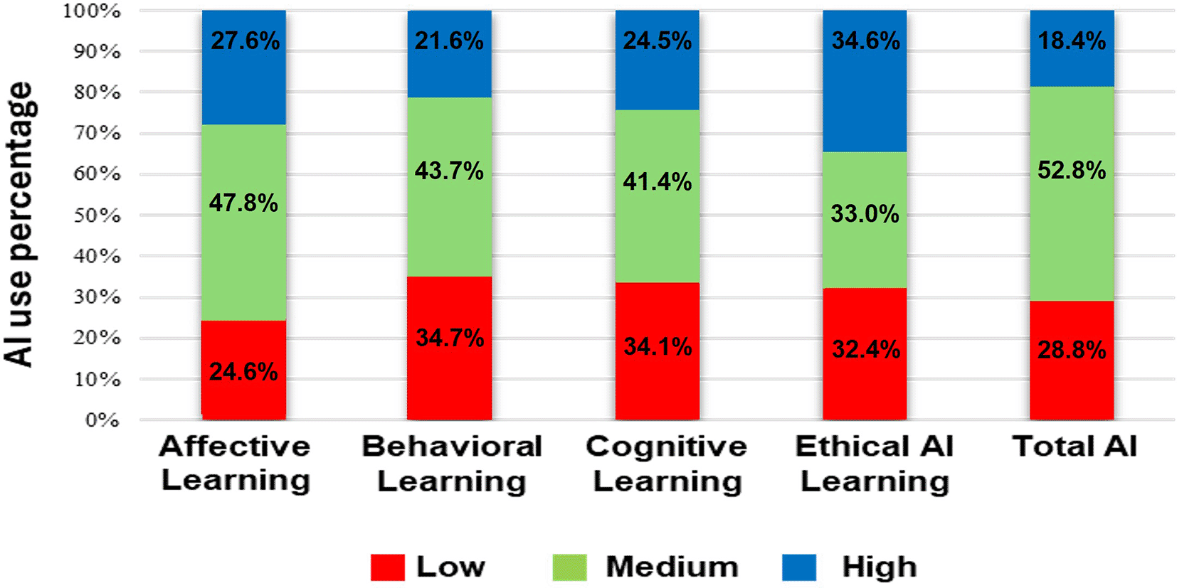 Note: The figure illustrates the distribution of AI use levels low, medium, and high across the affective, behavioral, cognitive, and ethical learning dimensions, showing a predominance of medium-level engagement among university students.
