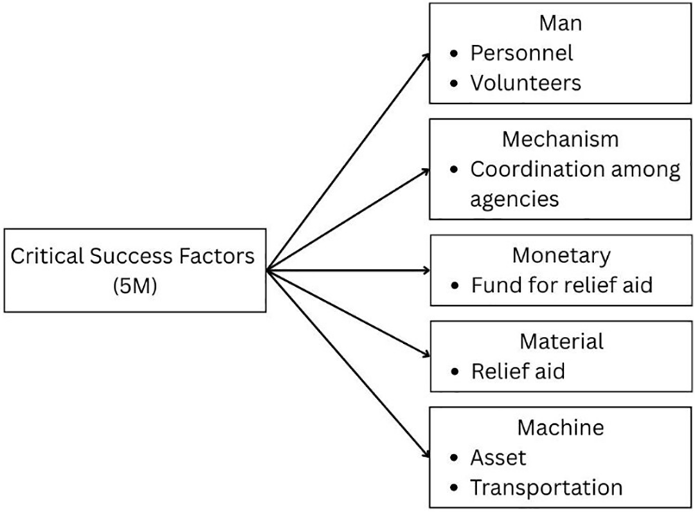 The 5M Framework demonstrates how the performance of disaster relief efforts is influenced by a number of factors, including skilled personnel (Man), well-coordinated management structures (Mechanism), sufficient financial support (Monetary), well-managed supplies (Material), and effective logistical assets (Machine). This framework emphasises that these factors must be integrated and aligned for humanitarian logistics to be effective. It gives organisations a comprehensive viewpoint to improve their response, recovery, and readiness plans for upcoming disaster operations.