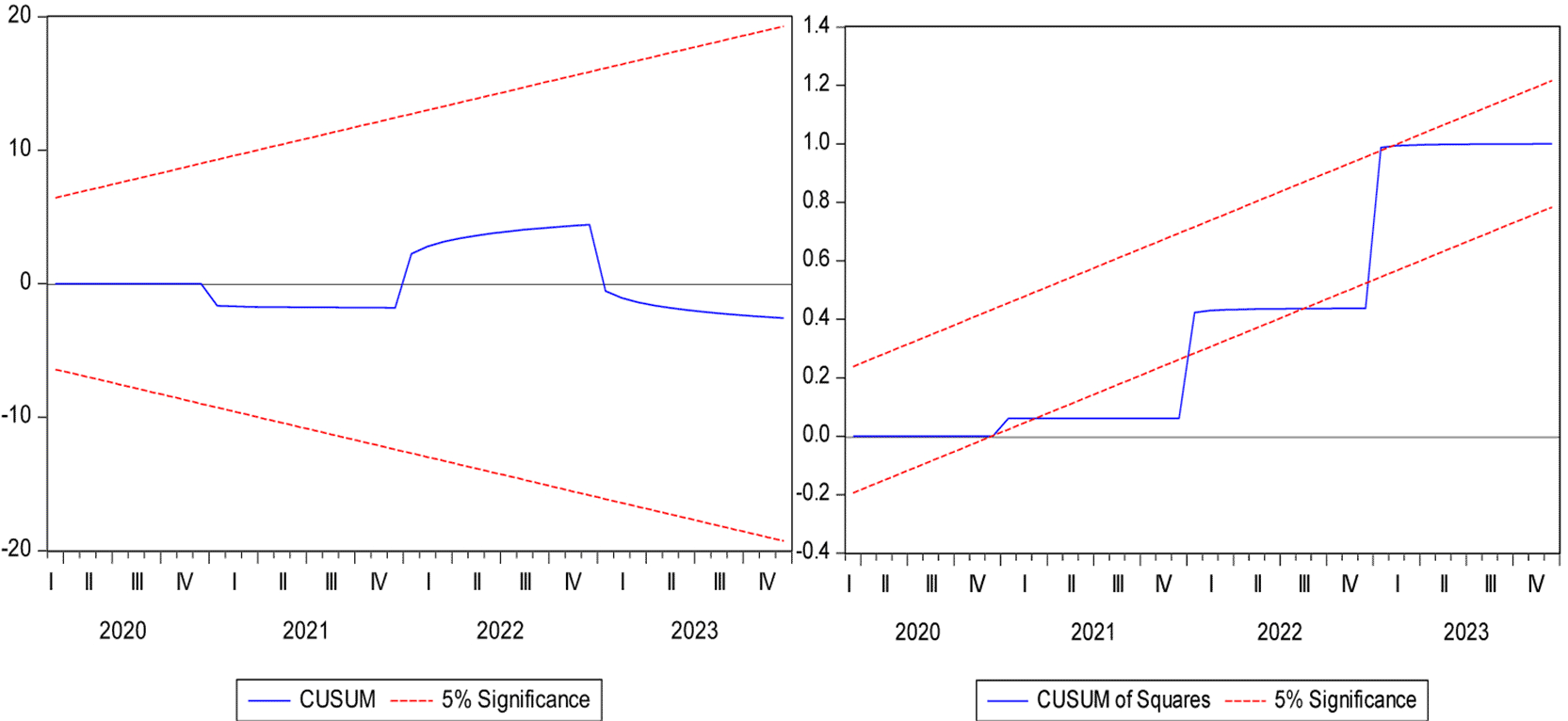 Looking at Figure 2, the two tests show a degree of stability and consistency between the long-term and short-term parameters, as the cumulative sum of recurrent residuals (cusum) test statistic fell within the critical limits at a significance level of 5%.