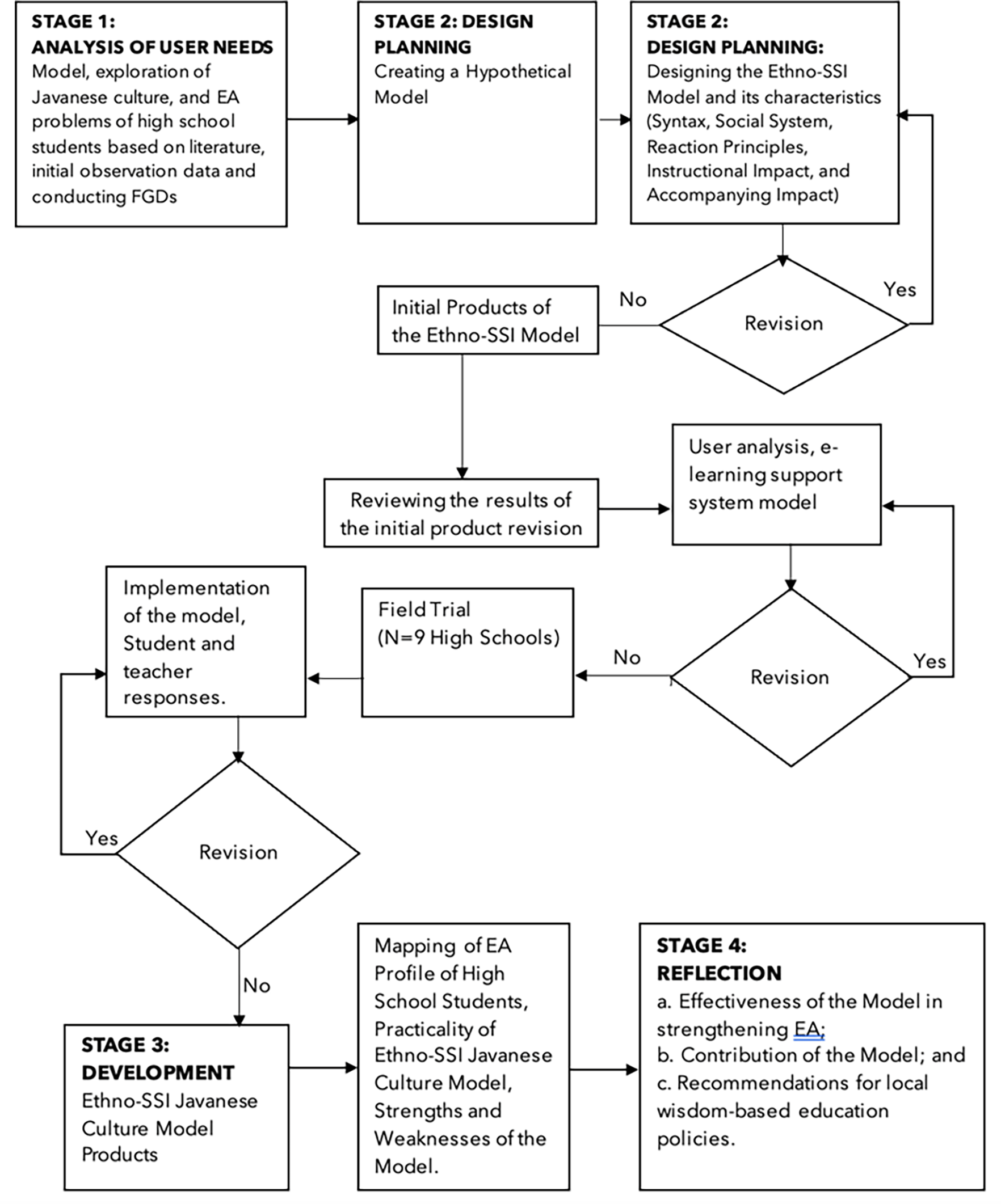 The research procedure, Design-Based Research (DBR)23 ( Figure 1), was used to understand the objectives of the Ethno-SSI Javanese Culture model, which has an instructional impact on high school students’ EA. DBR was adapted to produce a model product consisting of four steps: needs analysis, design planning, development, and reflection of results. In the needs analysis step, the researcher identified the needs regarding the ethno-SSI Javanese Culture model. Based on the needs analysis, the initial model design was developed in the planning, design, and development stages. Finally, the successful use of the model was evaluated in the reflection stage to determine the model’s effectiveness and recommend policies.
