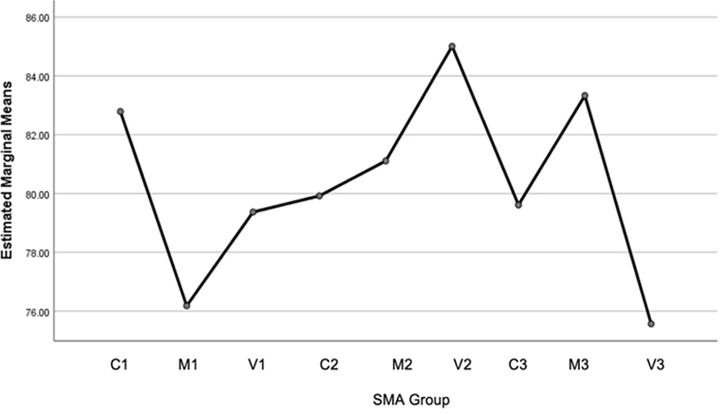 | SMA-M2 | SMA-C1 | -1.6786 | 2.47525 | .999 | -9.4294 | 6.0723 |