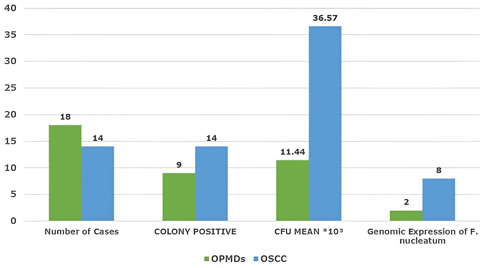 Figure 1. Microbiologically and genomically positive cases of F. Nucleatum in OPMDs and OSCC groups.