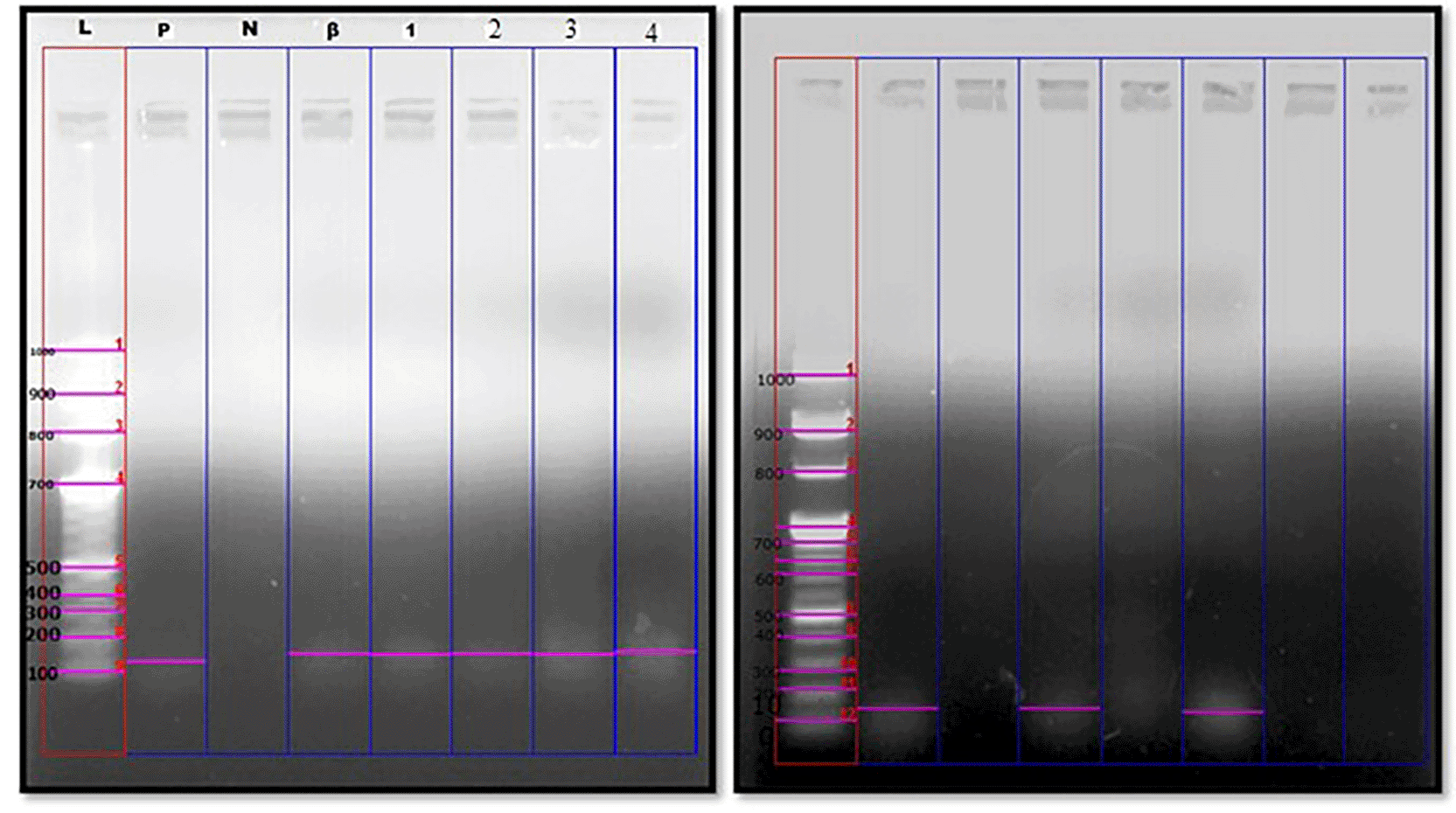L-DNA ladder at 100bp; P-Positive control; N-Negative control; β-beta globin housekeeping gene; 1-4: Samples.