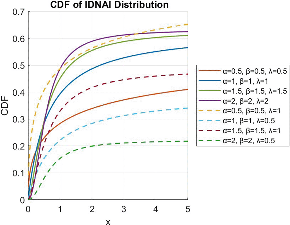 Figure 2 shows the cumulative distribution function graph for the IDNAI distribution with certain parameter values. The CDF graph in Figure 2 shows that the cumulative distribution function of the IDNAI distribution is a function that does not decrease.