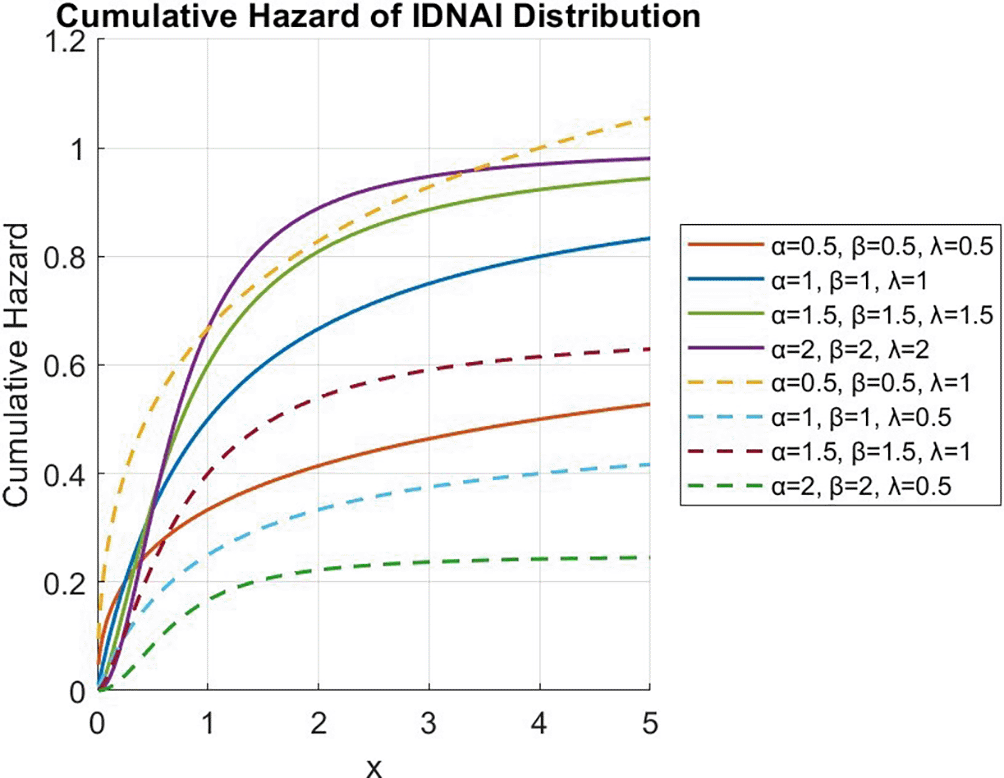 Figure 5 shows the cumulative hazard function of the IDNAI distribution. This shows how it may be used in survival analysis and reliability theory by showing the overall failure risk up to time x. It demonstrates that when x increases, the cumulative danger escalates, conforming to standard survival model expectations. When λ is larger, the hazard accumulation is higher, which means the failure rates are higher. When α and β are removed, the curves are flatter, which means the risk increase is lower. The graphic shows how the properties of the IDNAI distribution change based on different dependability scenarios.