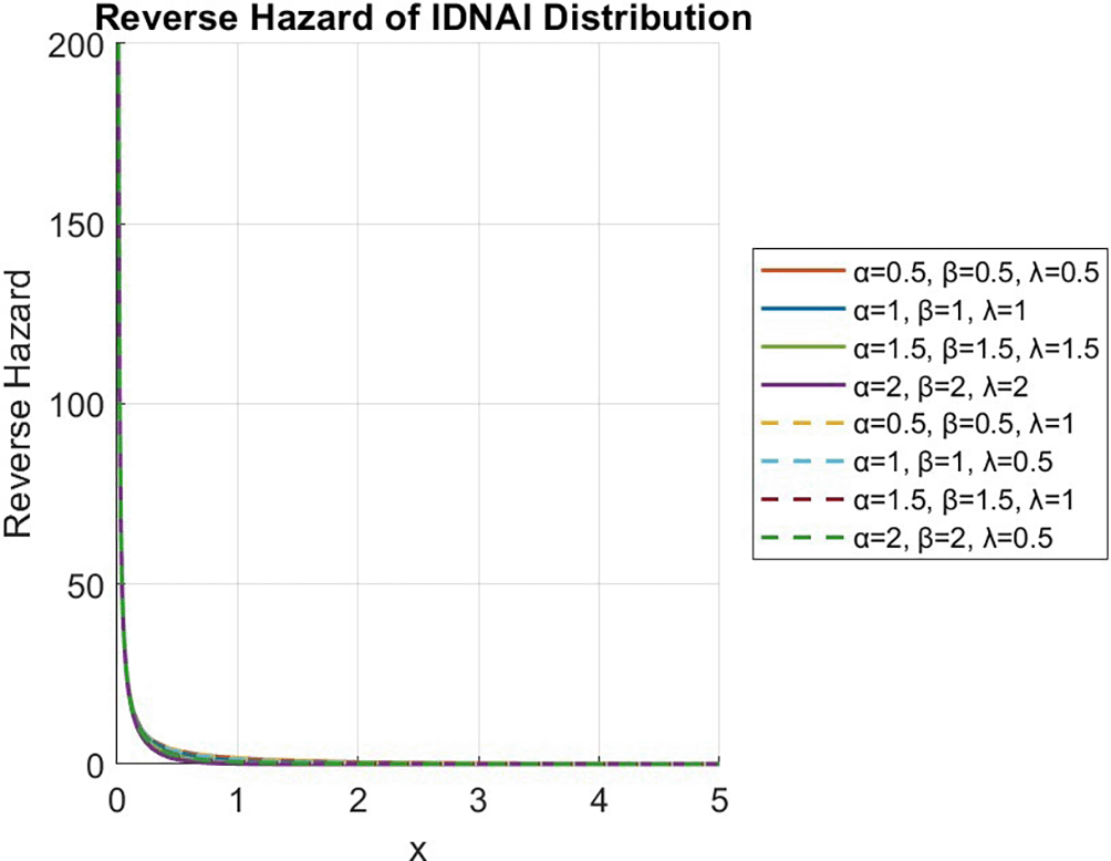 The graph in Figure 6 shows how the reverse hazard function of the IDNAI distribution changes when different parameters are used, especially λ, which affects failure rates. This function is very important for survival modeling and reliability analysis since it shows how strong the distribution is in situations when reliability is important.