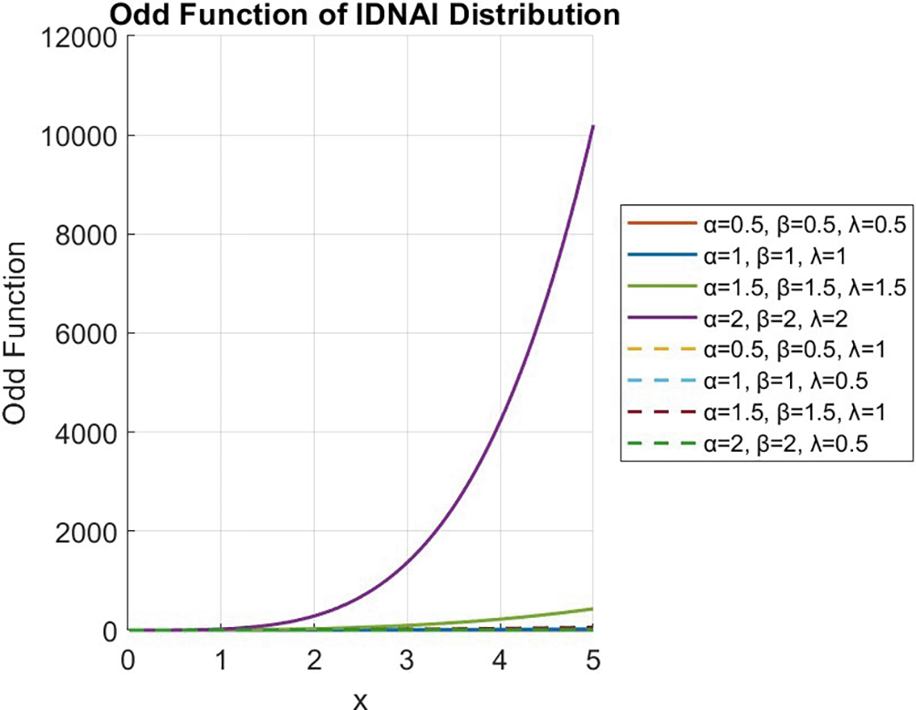 Figure 7 shows that the odd function grows quickly as x gets bigger, especially when the parameters α, β, and λ are big. Solid curves with λ = 1 expand a lot faster than those with λ = 0.5, which shows that the tail behavior is stronger. This function is a good way to show how flexible a model is and how well it controls its tail because it is very sensitive to changes in its parameters.