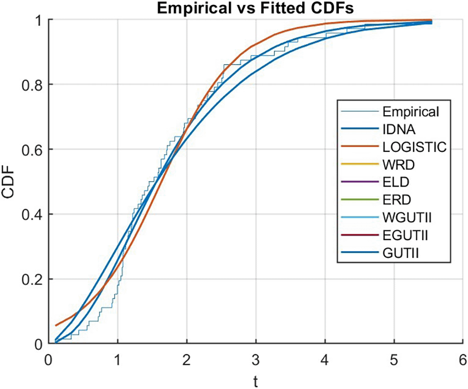 The graph in Figure 8 shows how well a model fits by comparing the empirical cumulative distribution function (CDF) of a dataset with many fitted CDFs from theoretical models. The empirical CDF and IDNAI and LOGISTIC are very near, while WGUTII, EGUTII, and GUTII are only moderately close. WRD and ELD, on the other hand, are very different from each other.