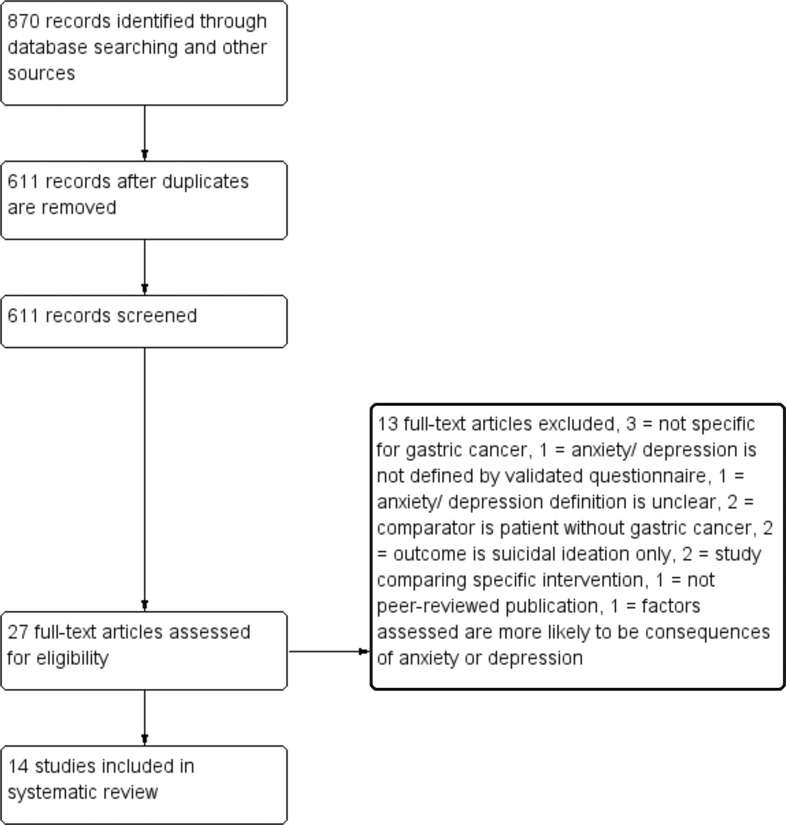 Figure 1 shows the PRISMA study flow chart. Initially, 870 records were obtained from the database searches. After deduplication, 611 articles were obtained. Two independent reviewers performed screening of the titles and abstracts, resulting in 27 articles for a full-text review. After applying the exclusion criteria, 14 studies were included for the systematic review. The total number of patients was 31,660. All articles evaluated risk factors of anxiety or depression, while five articles analyzed the impact of anxiety or depression on patient survival. Table S2 showed the excluded studies and the reasons for their exclusions.