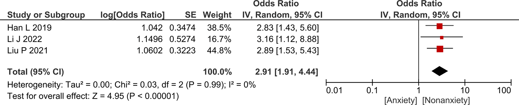 We also performed meta-analysis for risk factors that were analyzed in ≥ 3 studies and had a reported adjusted odds ratio value. Based on those criteria, we performed five meta-analyses (one for anxiety and four for depression). For the meta-analysis, we only used random-effect analysis owing to the low number of qualified studies. Figure 2 shows the forest plot for the association between female sex and anxiety in gastric cancer. The result showed that female sex was independently associated with increased odds of anxiety in gastric cancer (aOR = 2.91; 95% CI 1.91–4.44).
